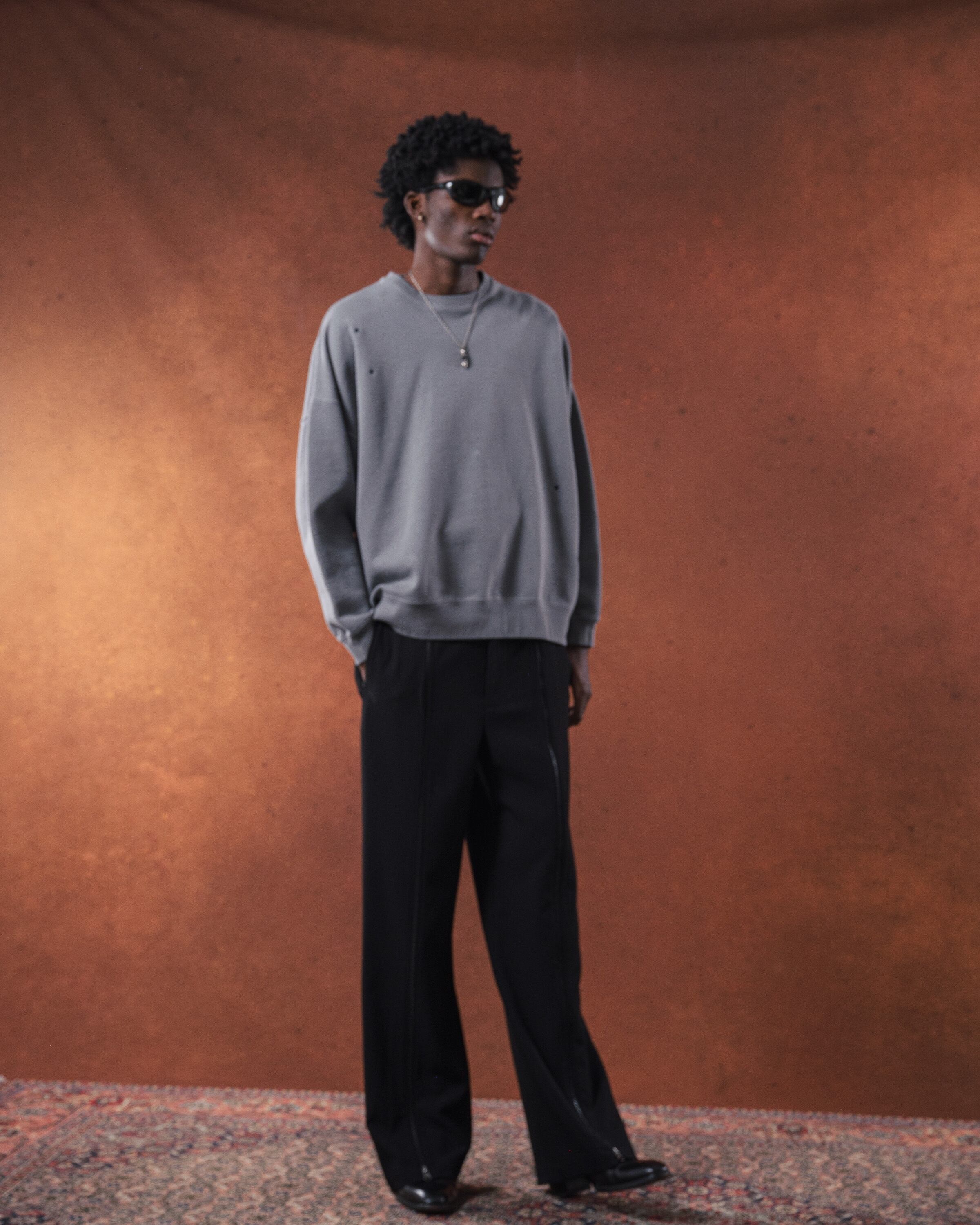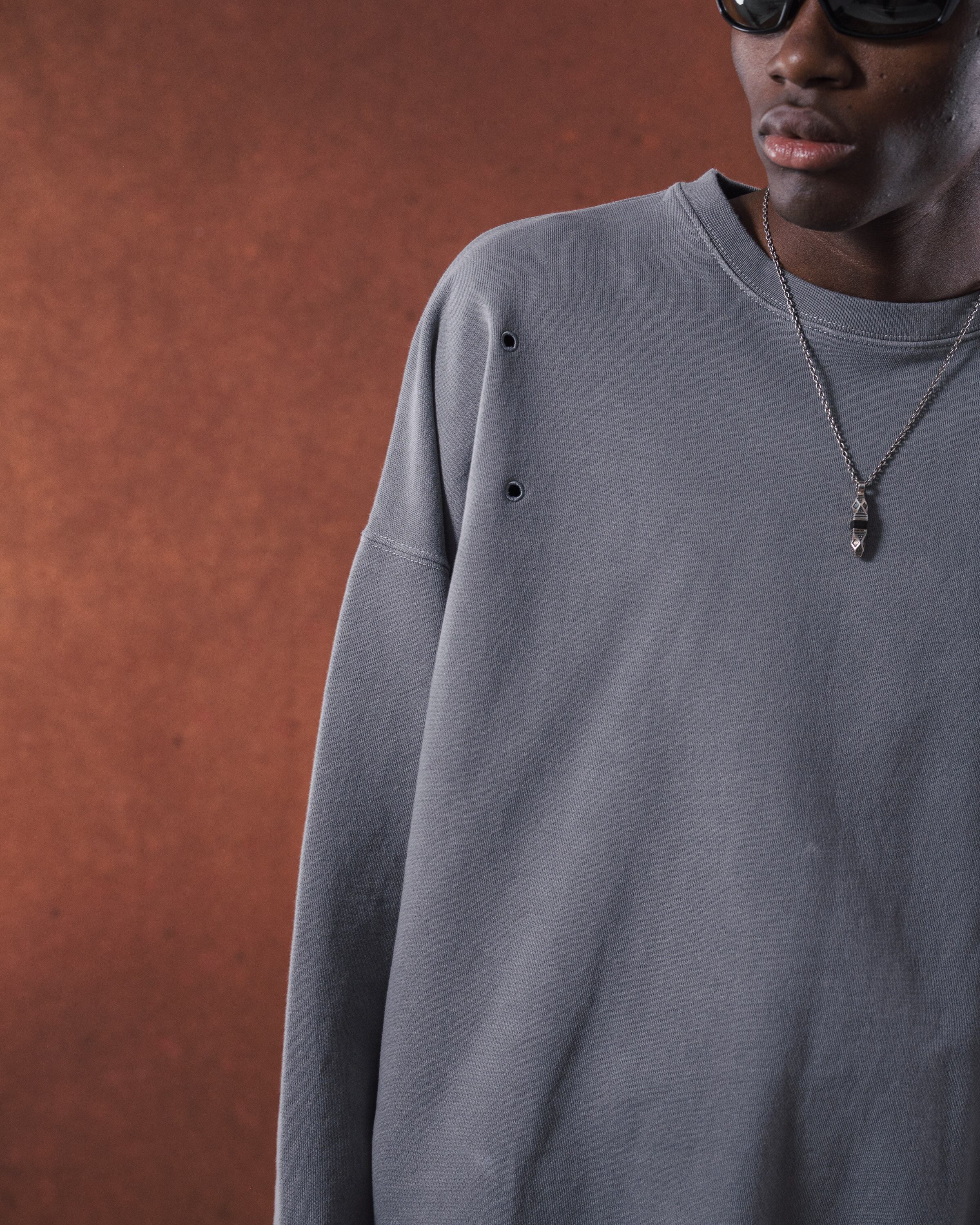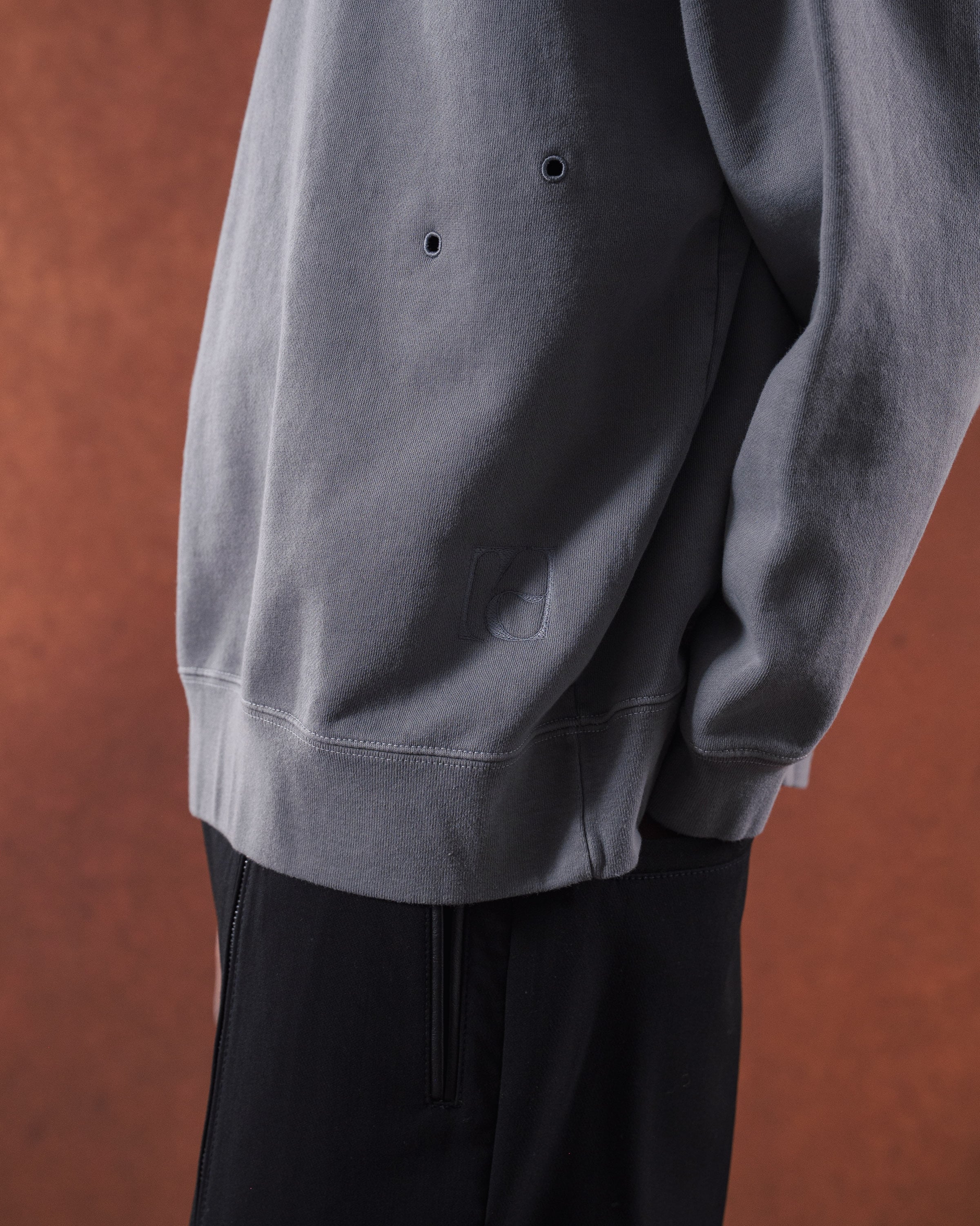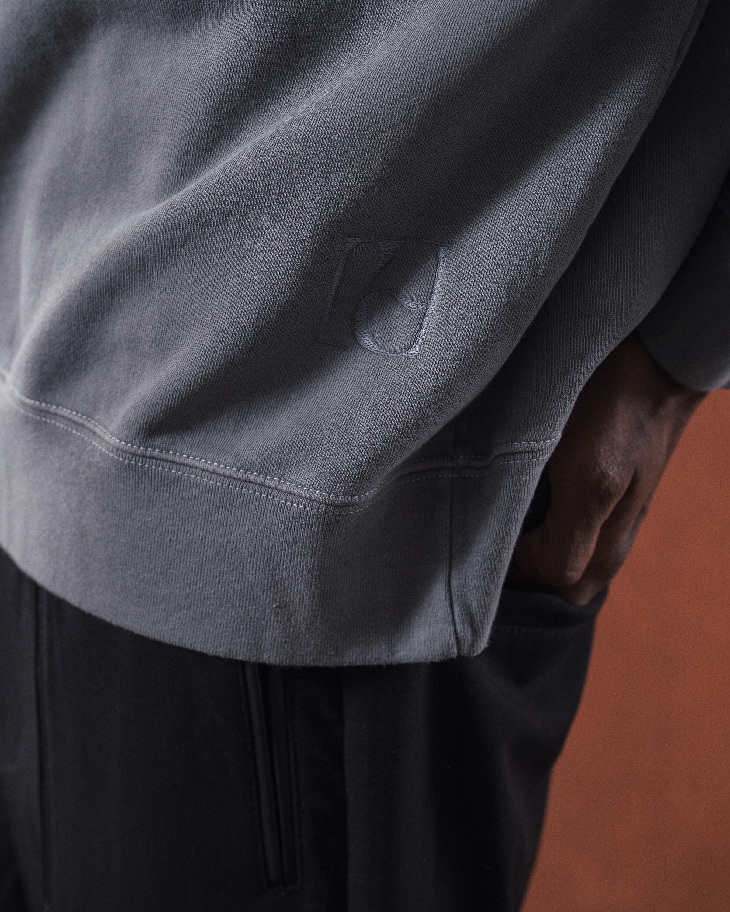しっかりと肉感のあるヘビーウェイトの裏毛素材。綿100%で肌触りが良く、きれいな目面に仕上がっています。製品にした段階でピグメント加工を施し、あえてヴィンテージ感のある風合いを狙っています。独特のフェード感のある色合いが特徴的な一着。