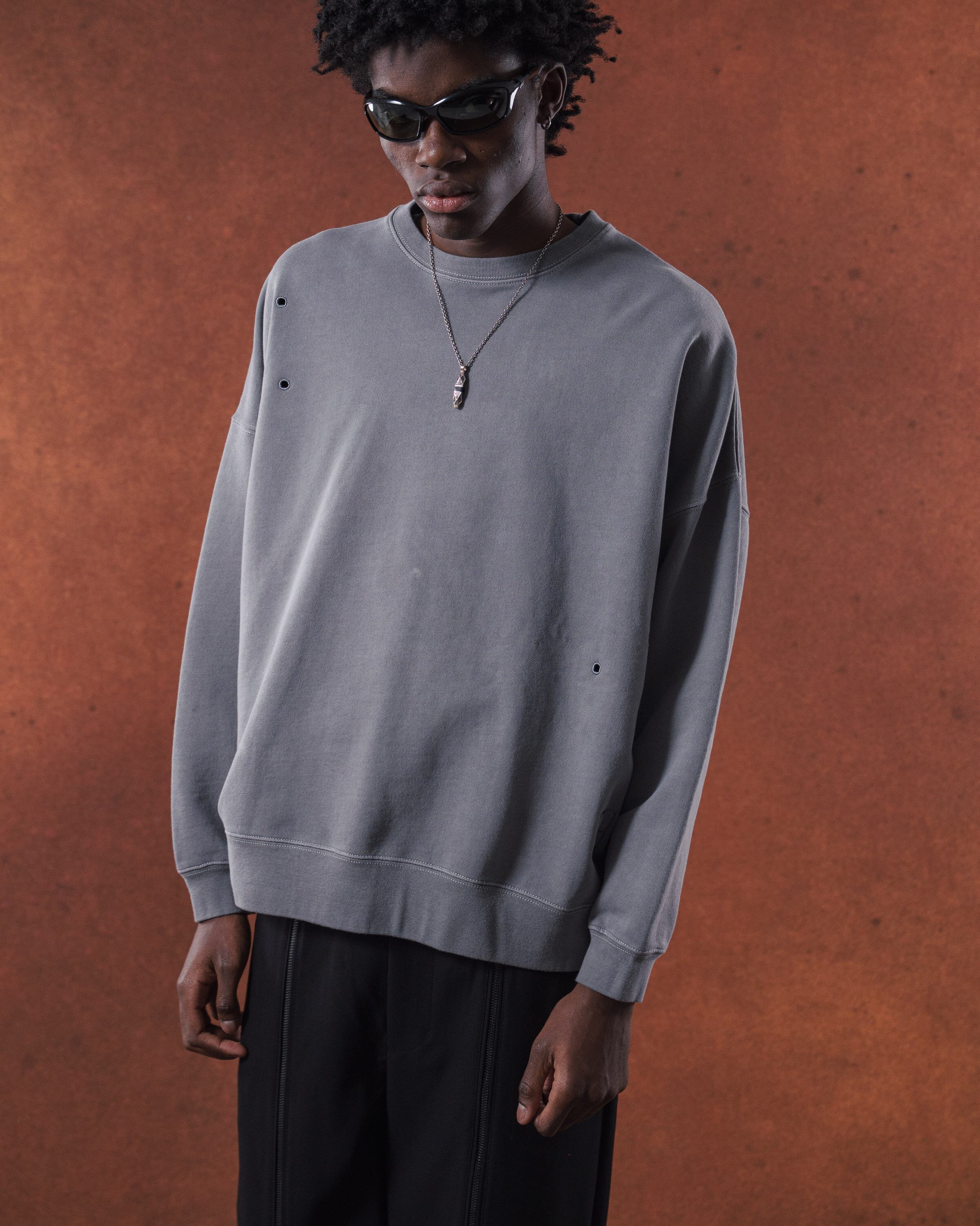 ピグメント加工を施したクルーネックスウェットデザイン。色あせた雰囲気が特徴的で、部分的に菊穴を施し、ヴィンテージ感を演出しています。左裾部分には同色のオリジナルロゴを刺繍しています。ややゆったりとしたシルエットでスタイリングにも使いやすいお勧めの一着です。