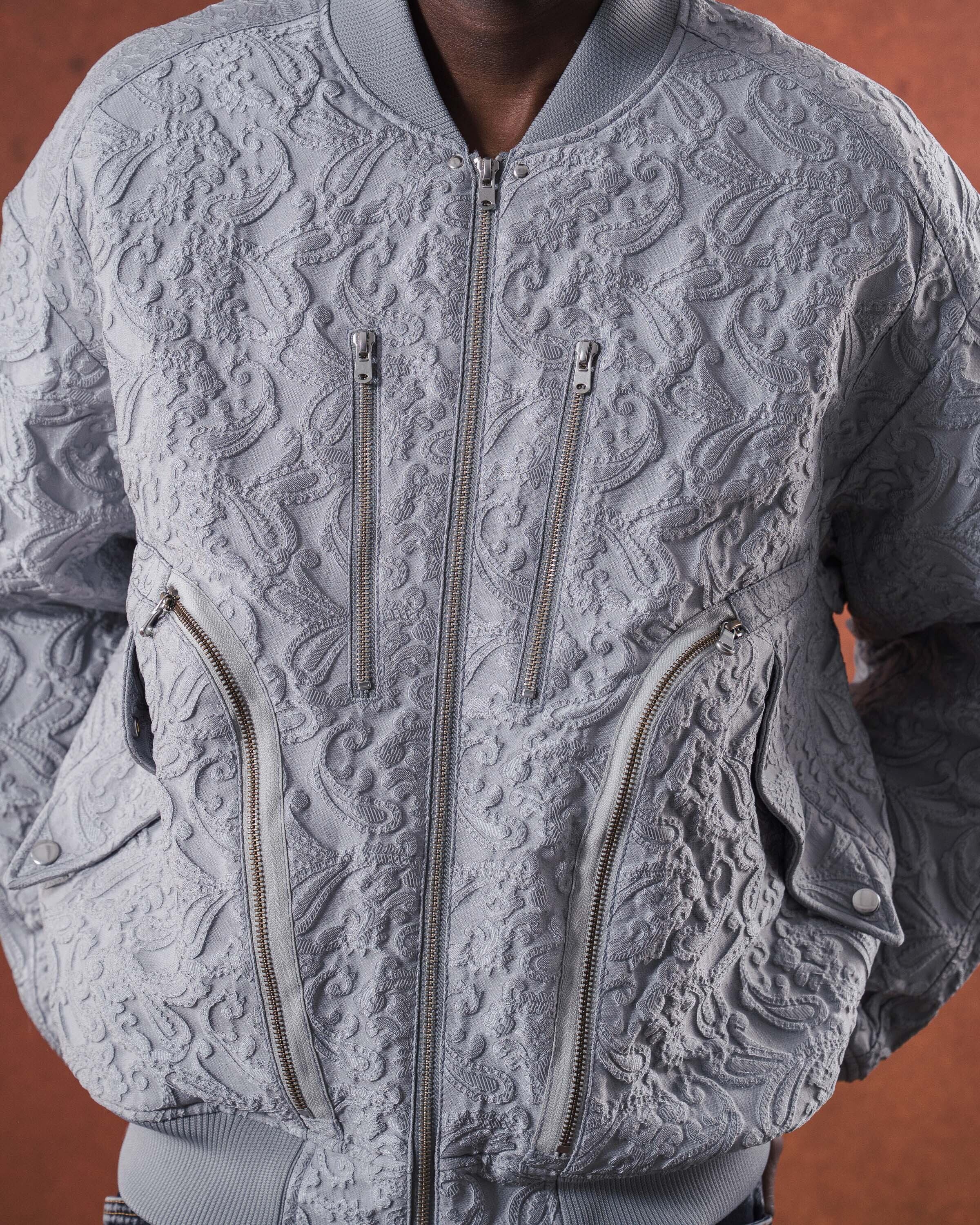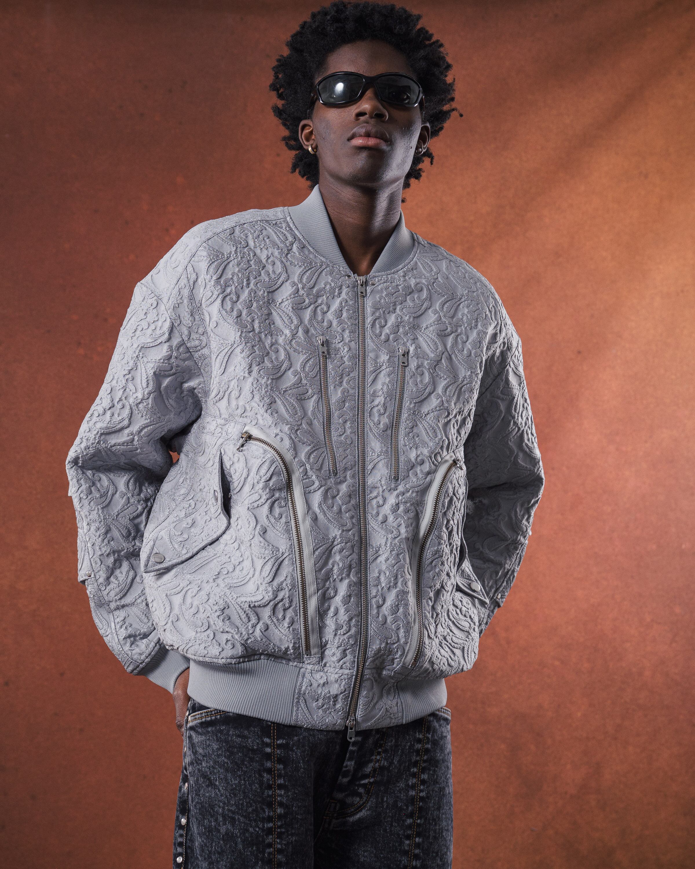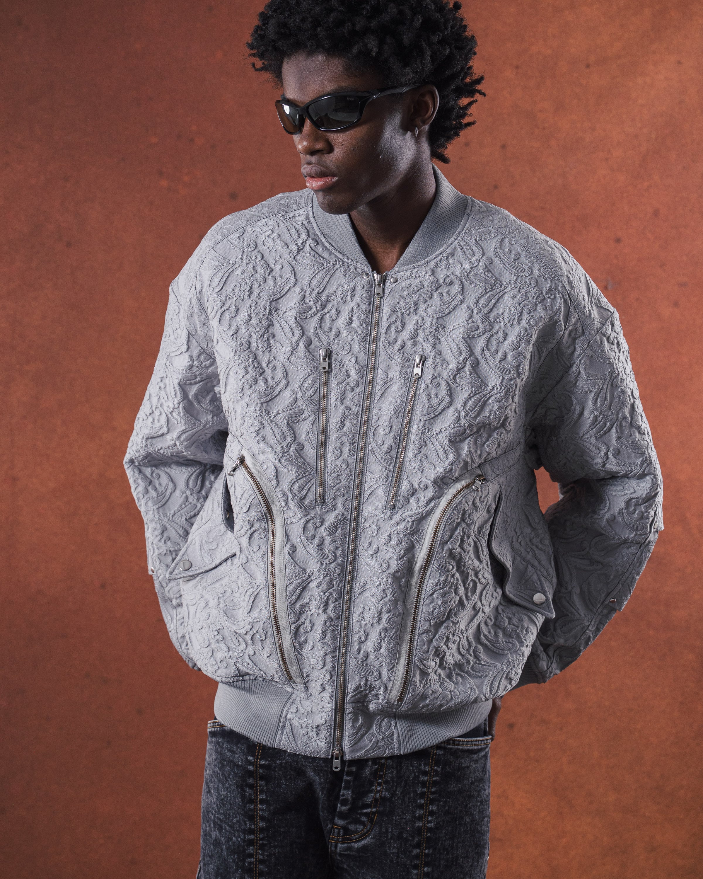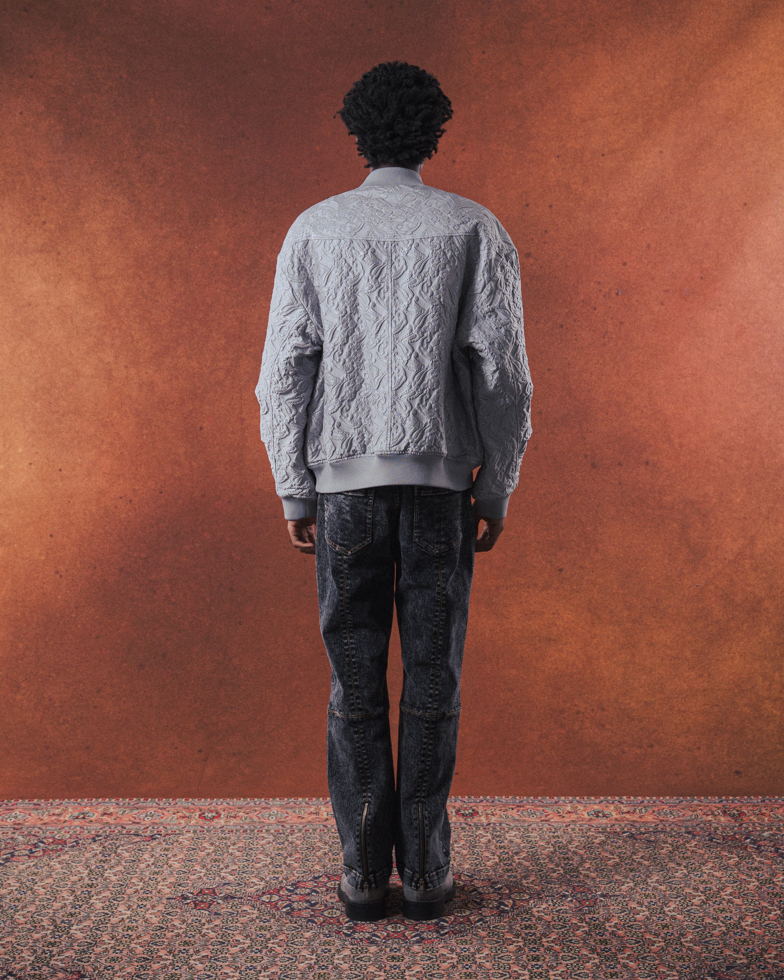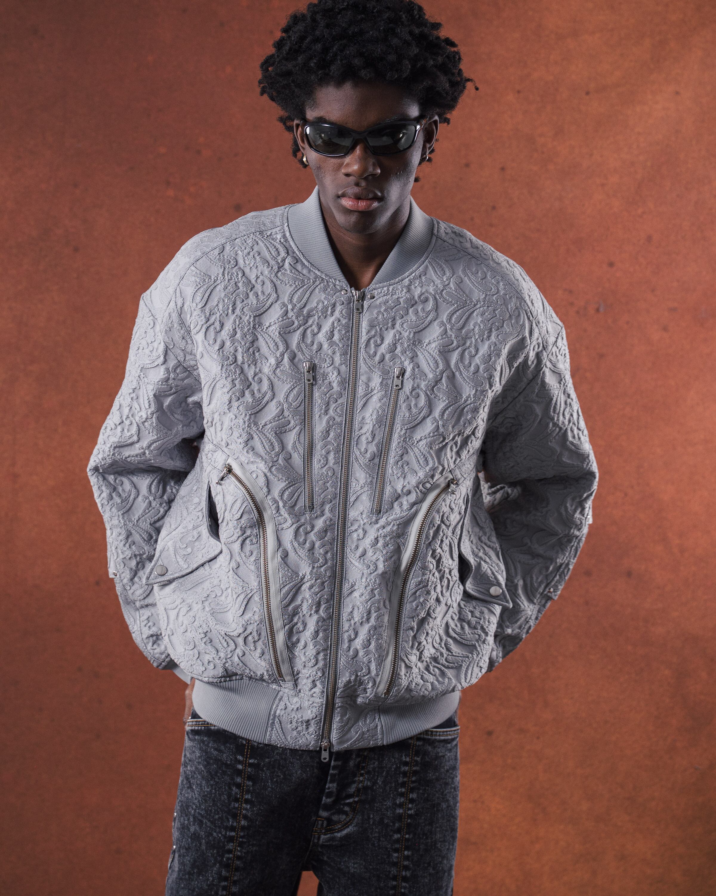 立体ポケットが特徴的な進化系ボンバージャケット。ジップをデザインのアクセントとしており、メタルの仕様が高級感を演出しています。袖口、裾にリブを配すことで、オーバーサイズかつ丸みのあるシルエットに設計されています。裏地には中綿をキルティング加工しています。