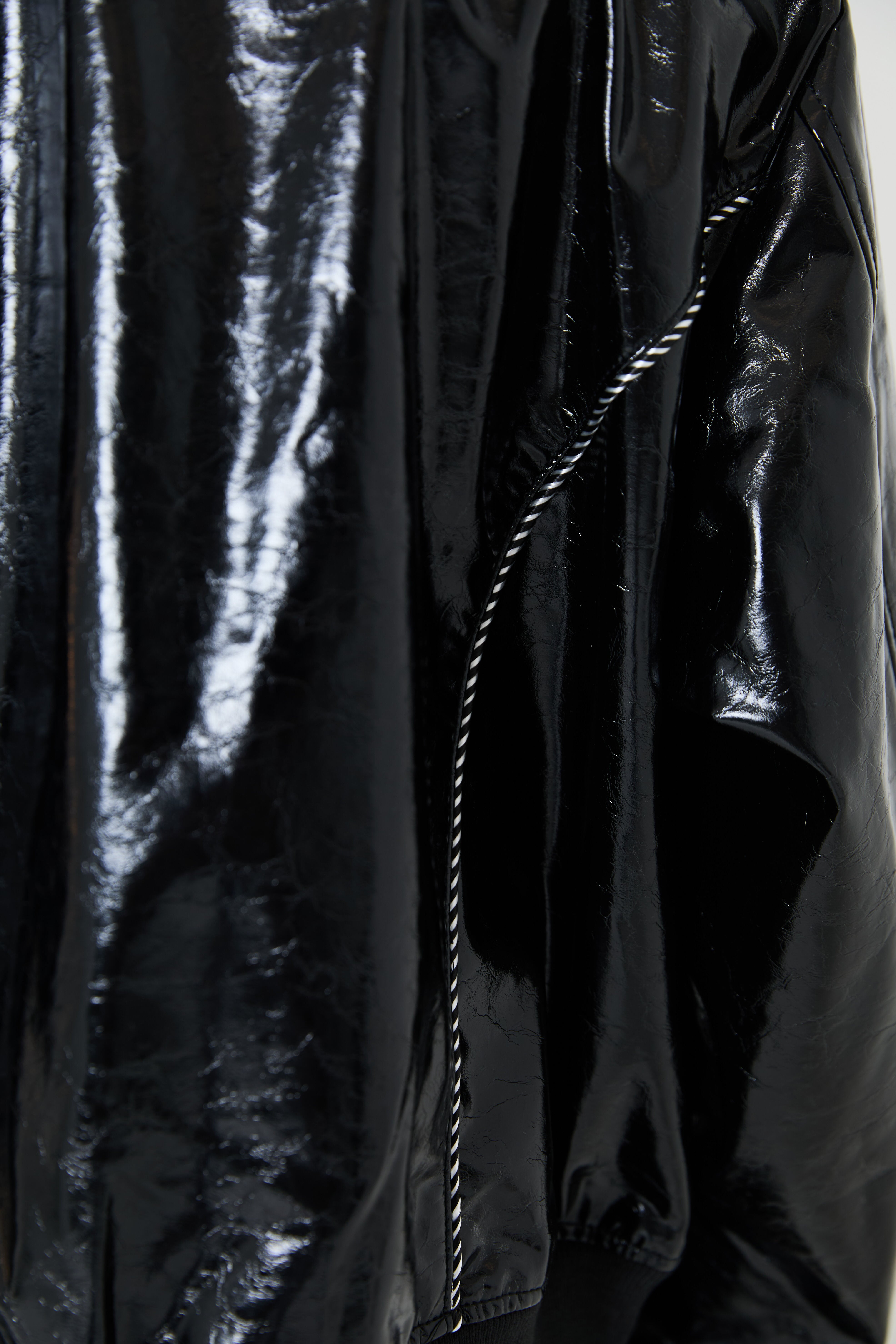 割れたようなクラッシュ加工とテカリ感を出す樹脂加工を施したフェイクレザー素材。ハードでありながらも光沢感が上品な仕上がりです。別布にはポリエステルのサテン素材を採用。同色異素材コンビーネーションにすることで、素材の陰影と立体感を表現しています。