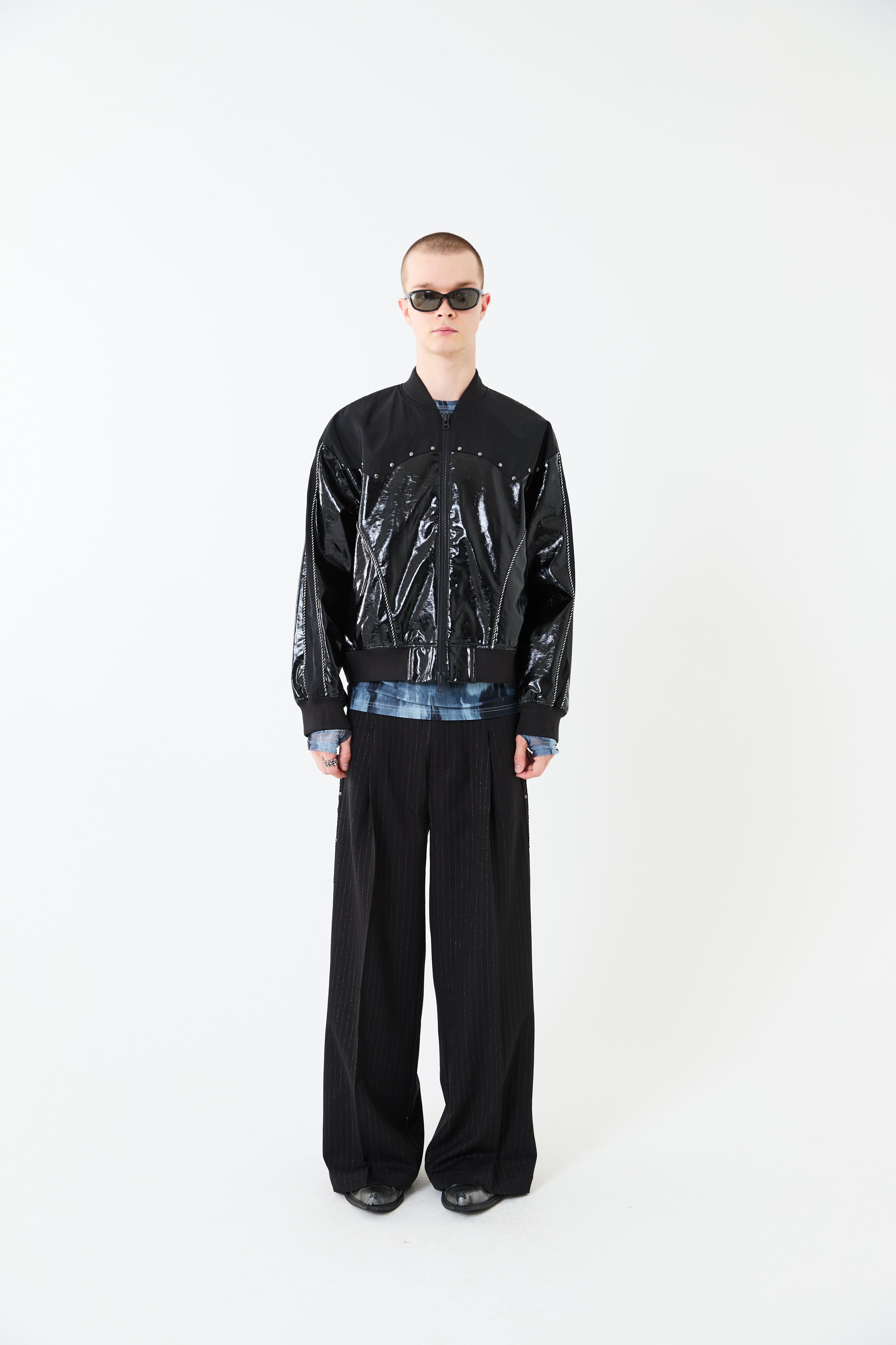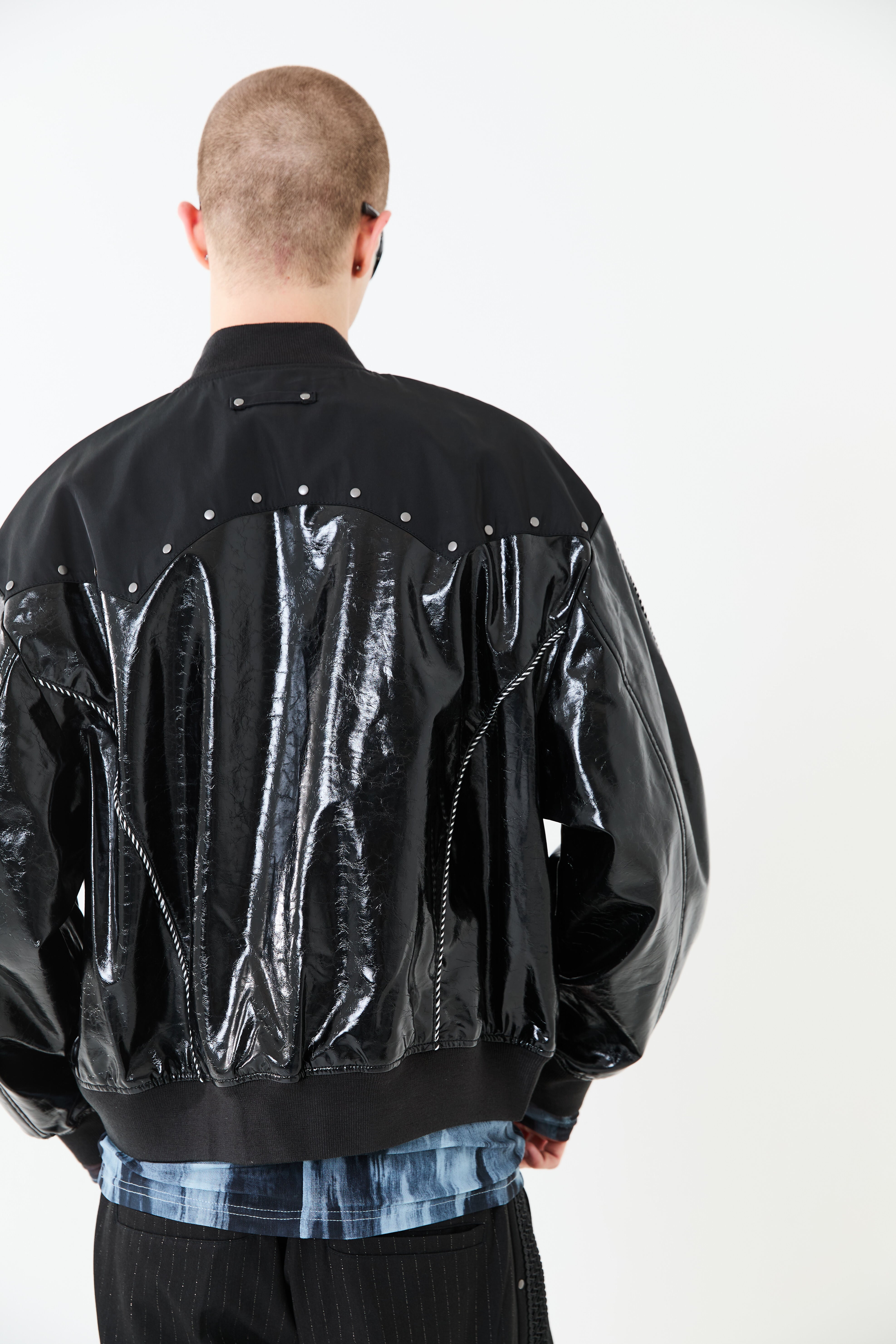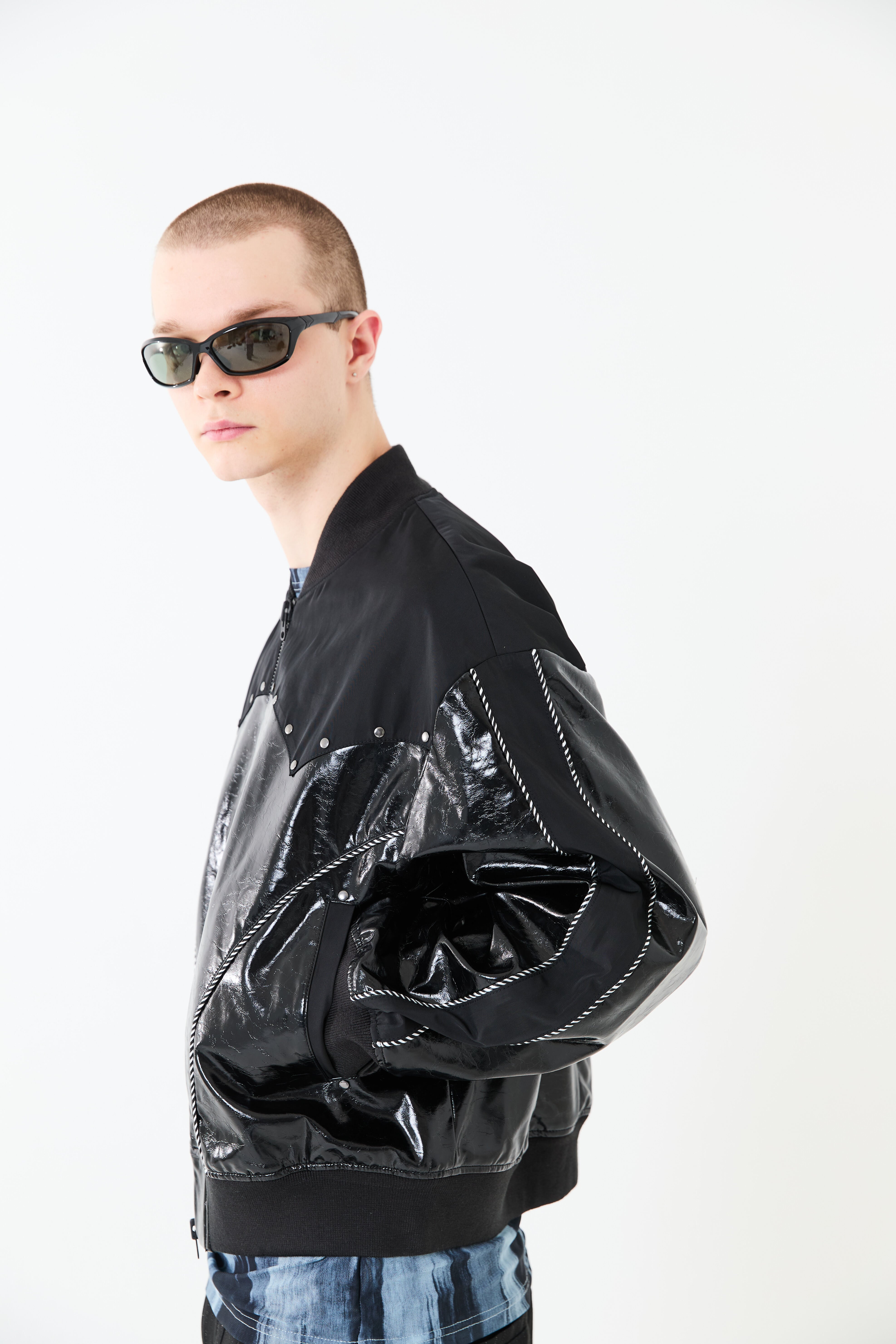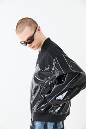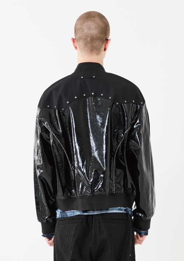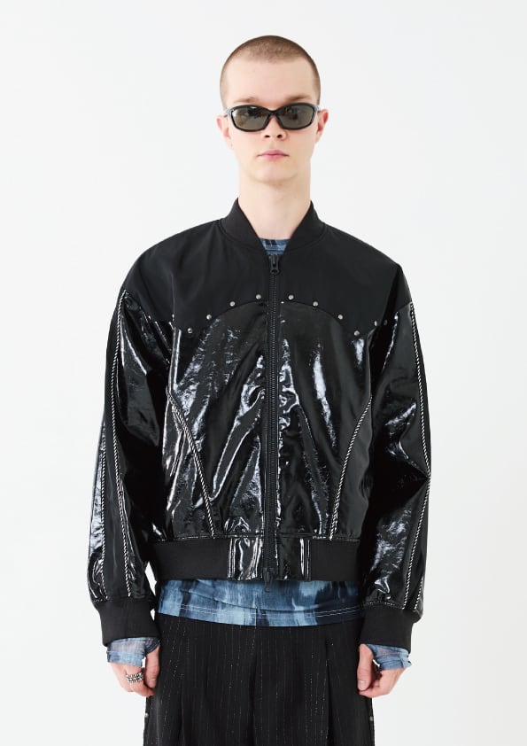 光沢のあるエコレザーとサテン素材をコンビにしたスーベニアジャケットデザイン。肩ヨーク部分をウエスタン調のカッティングにすることで、他にはないデザインアクセントをプラス。袖と身頃の切替部分にはスーベニアジャケットらしくストライプ柄のコードパイピングを施しています。また、メタルのスタッズを胸元にあしらうことで、カッティングデザインを際立たせ、光沢のレザーに負けないハードさを演出しています。