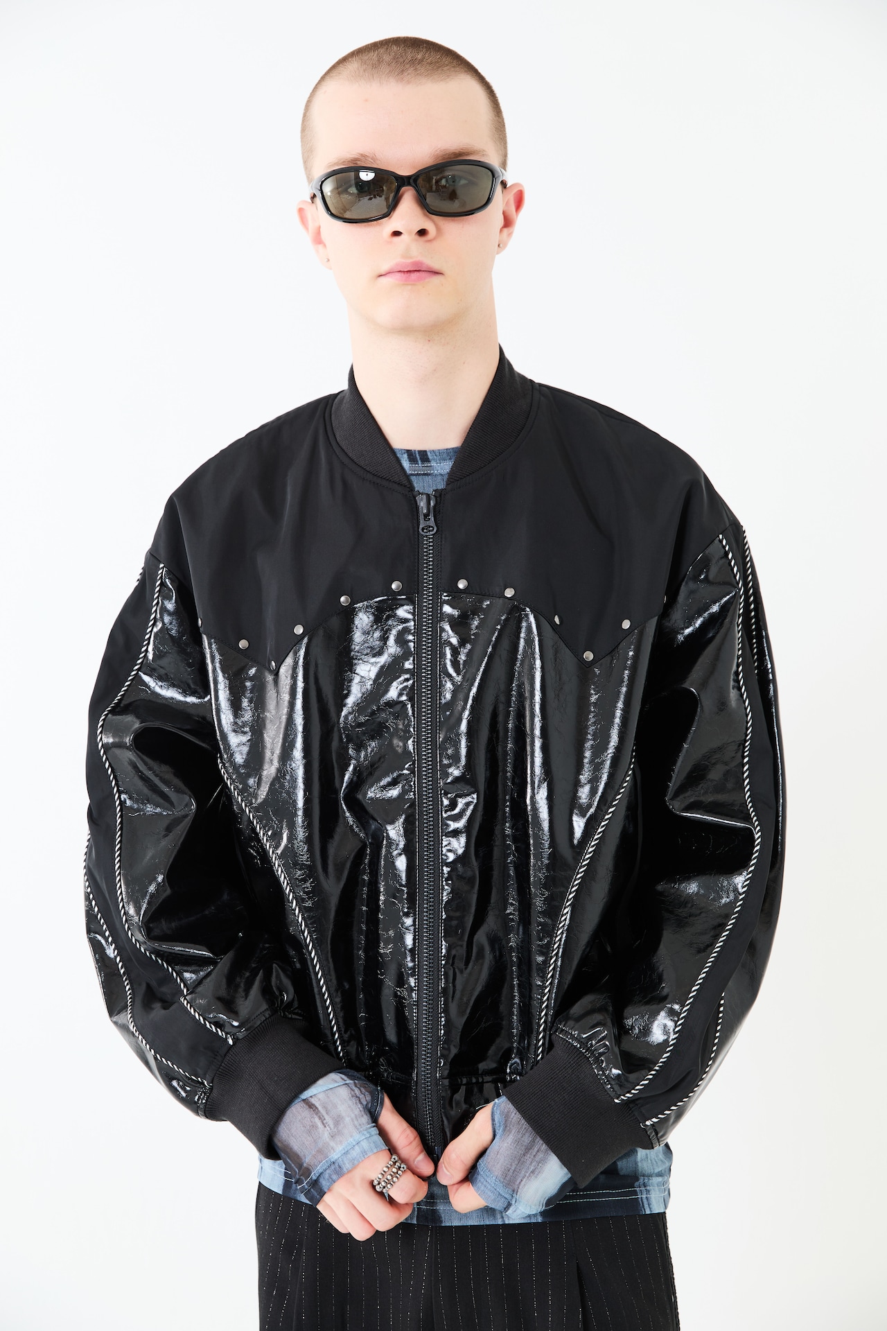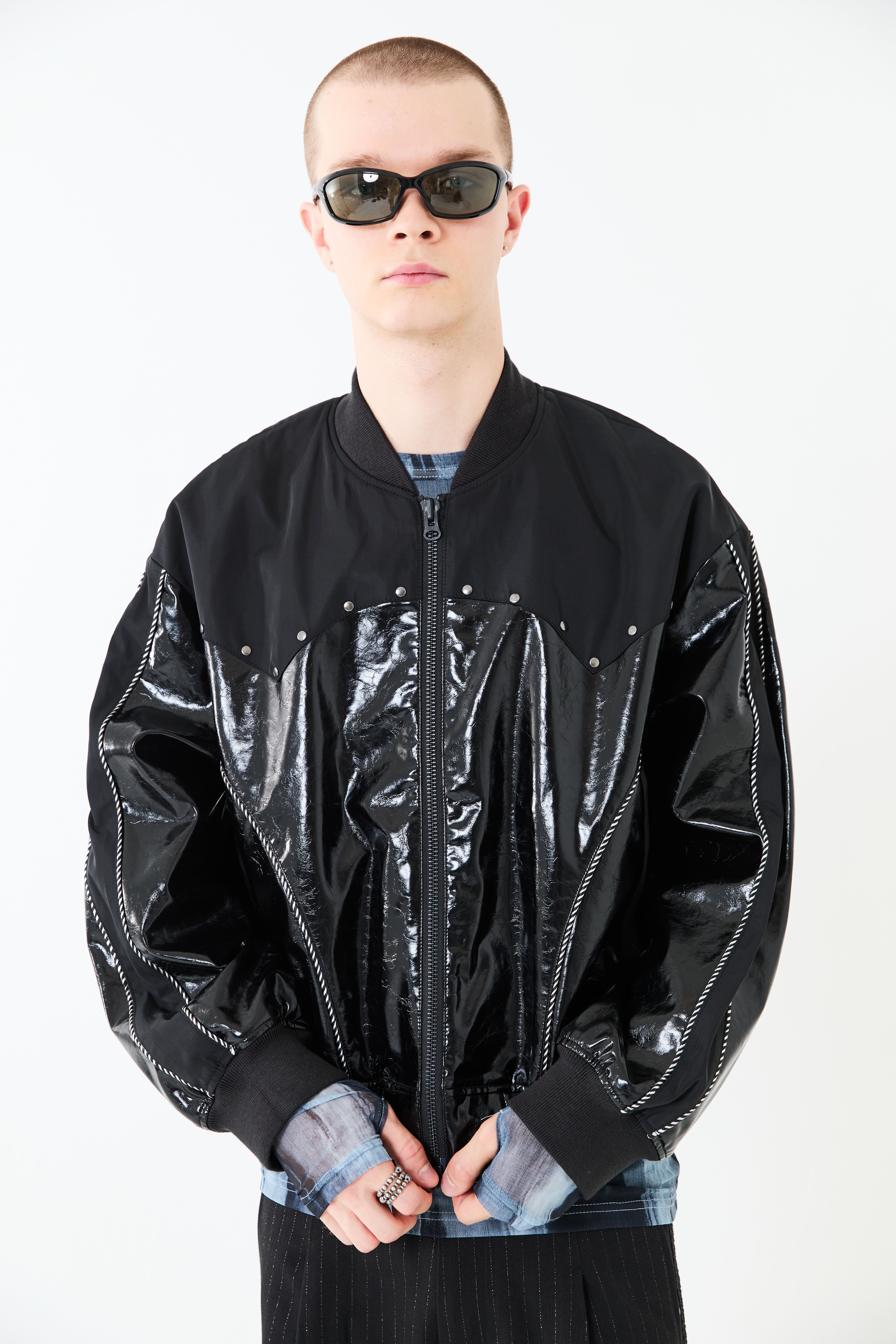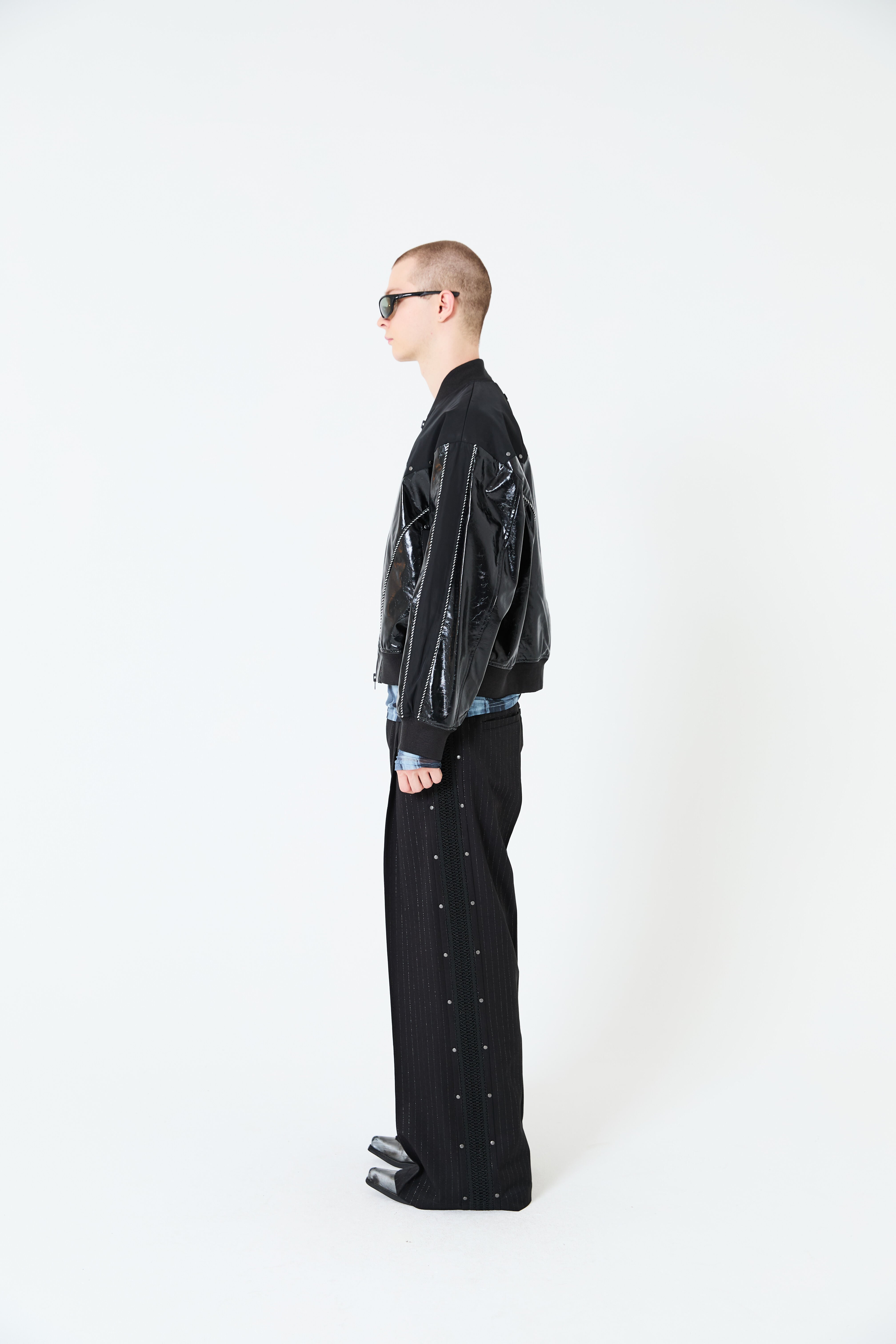 光沢のあるエコレザーとサテン素材をコンビにしたスーベニアジャケットデザイン。肩ヨーク部分をウエスタン調のカッティングにすることで、他にはないデザインアクセントをプラス。袖と身頃の切替部分にはスーベニアジャケットらしくストライプ柄のコードパイピングを施しています。また、メタルのスタッズを胸元にあしらうことで、カッティングデザインを際立たせ、光沢のレザーに負けないハードさを演出しています。
