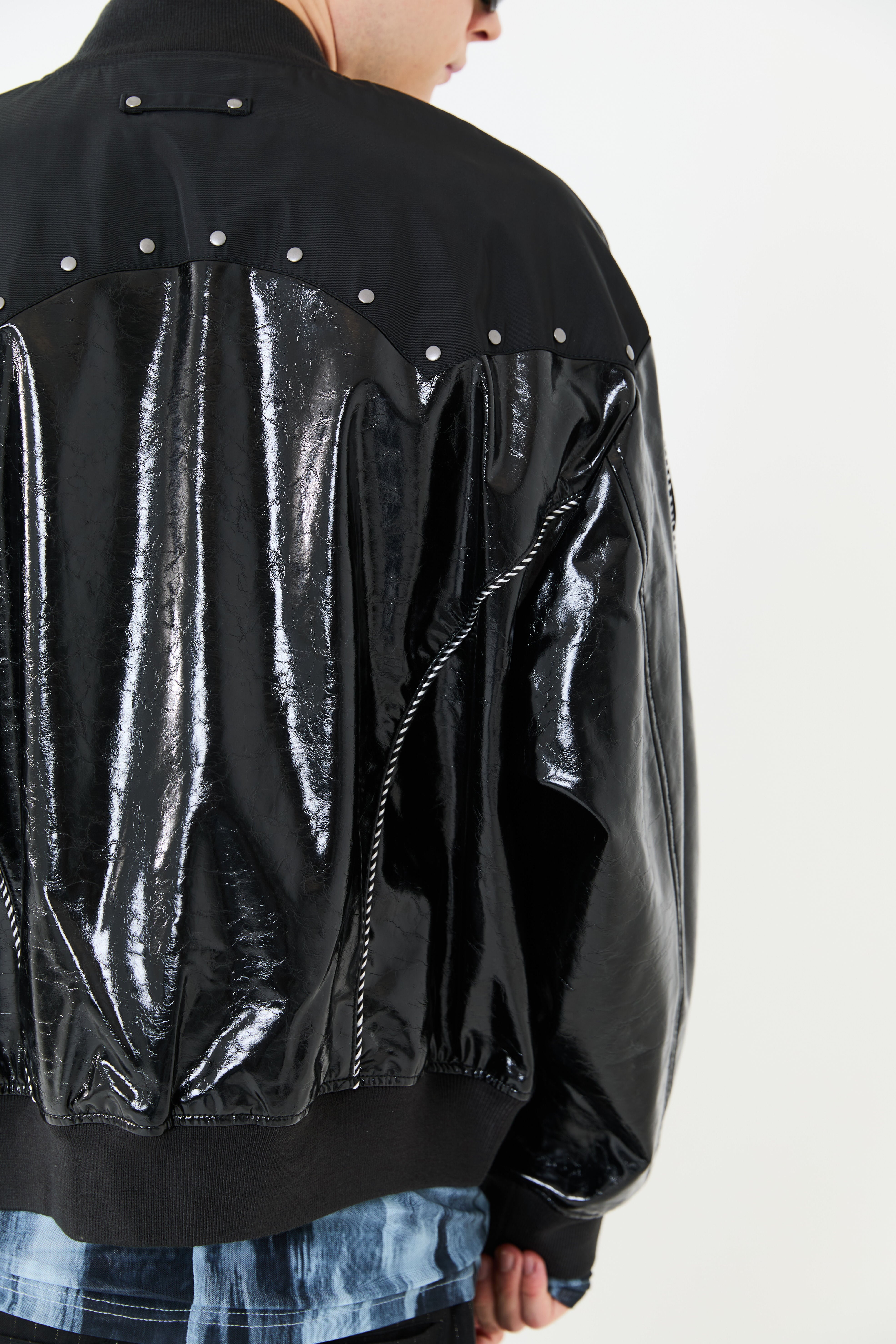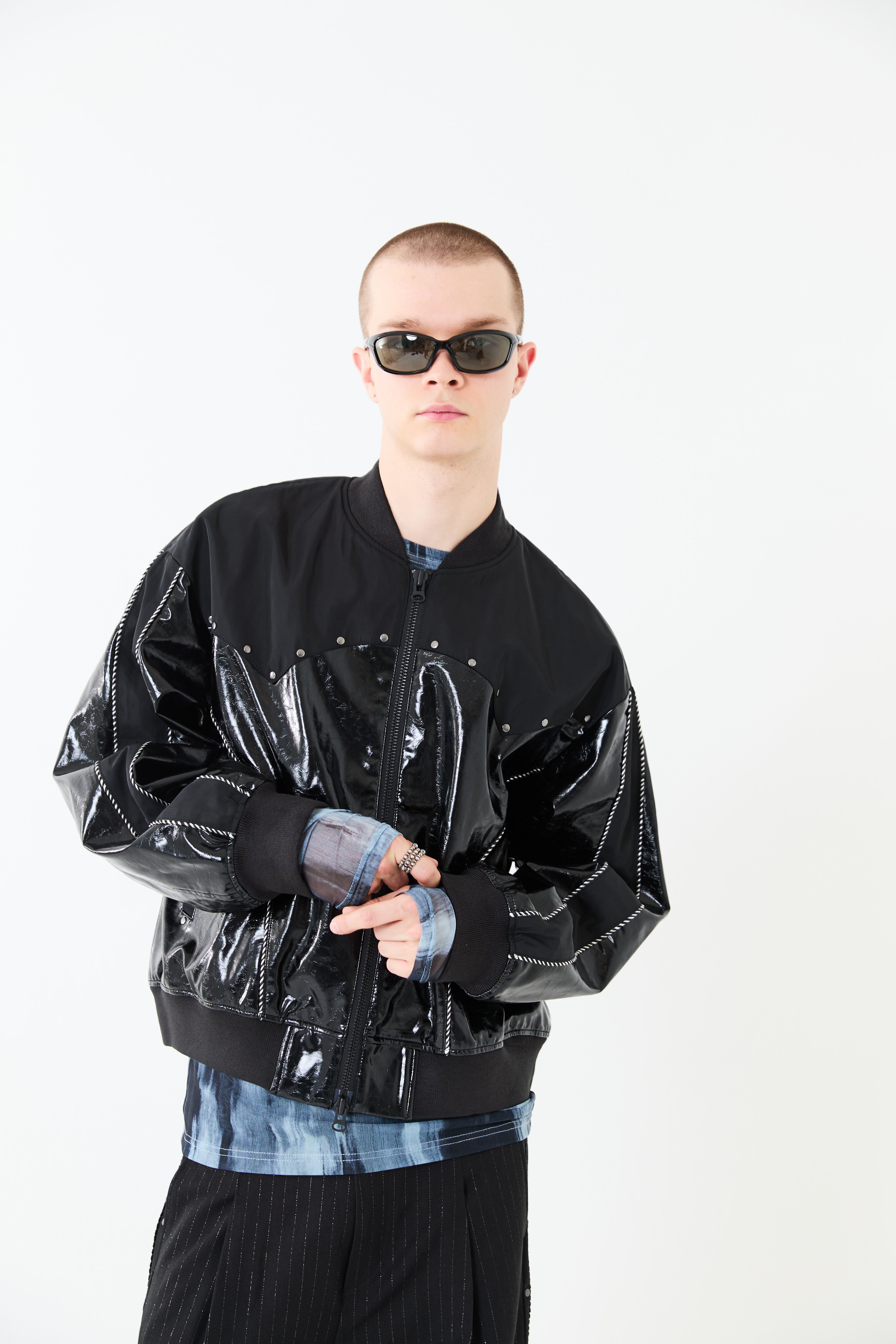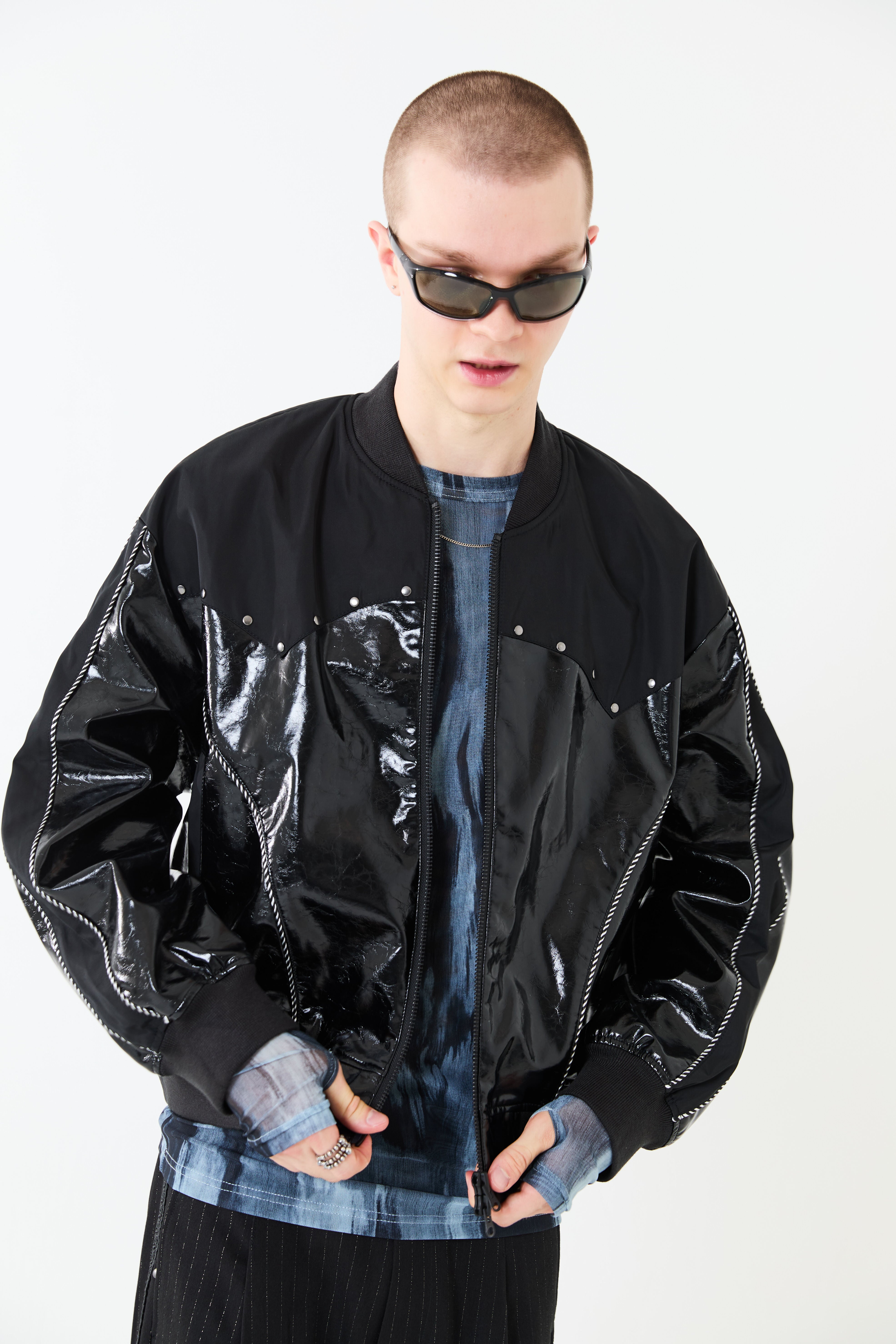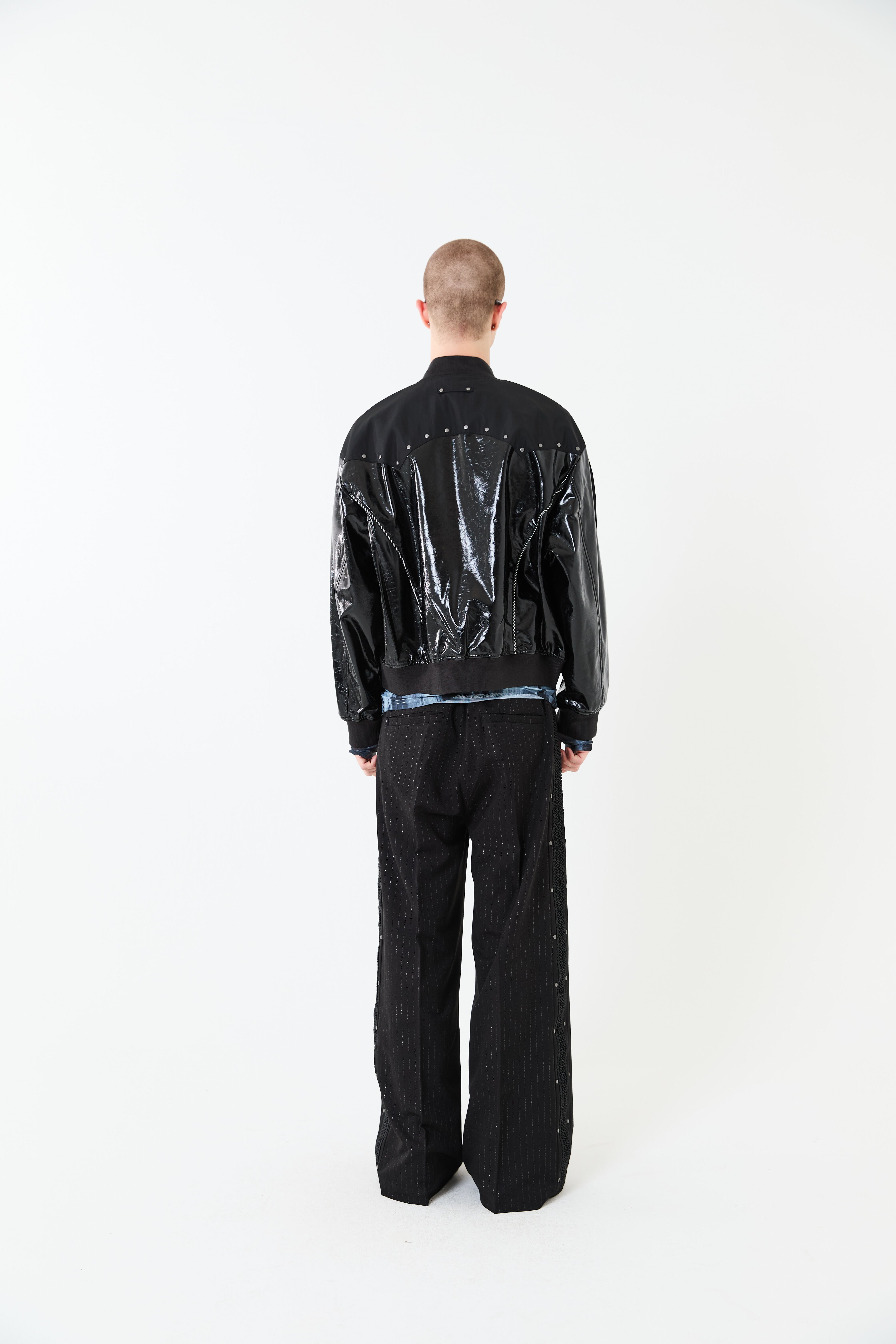 光沢のあるエコレザーとサテン素材をコンビにしたスーベニアジャケットデザイン。肩ヨーク部分をウエスタン調のカッティングにすることで、他にはないデザインアクセントをプラス。袖と身頃の切替部分にはスーベニアジャケットらしくストライプ柄のコードパイピングを施しています。また、メタルのスタッズを胸元にあしらうことで、カッティングデザインを際立たせ、光沢のレザーに負けないハードさを演出しています。
