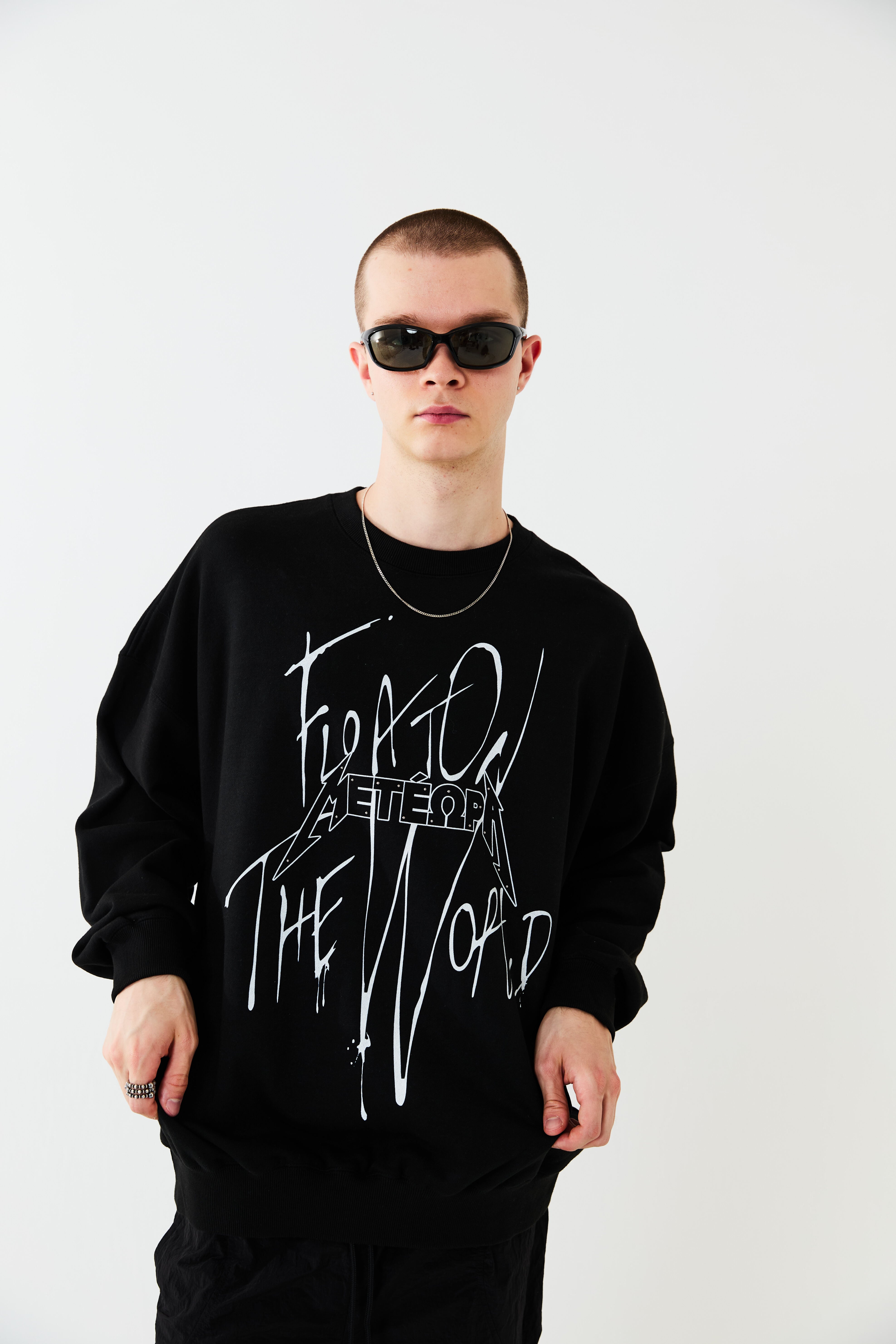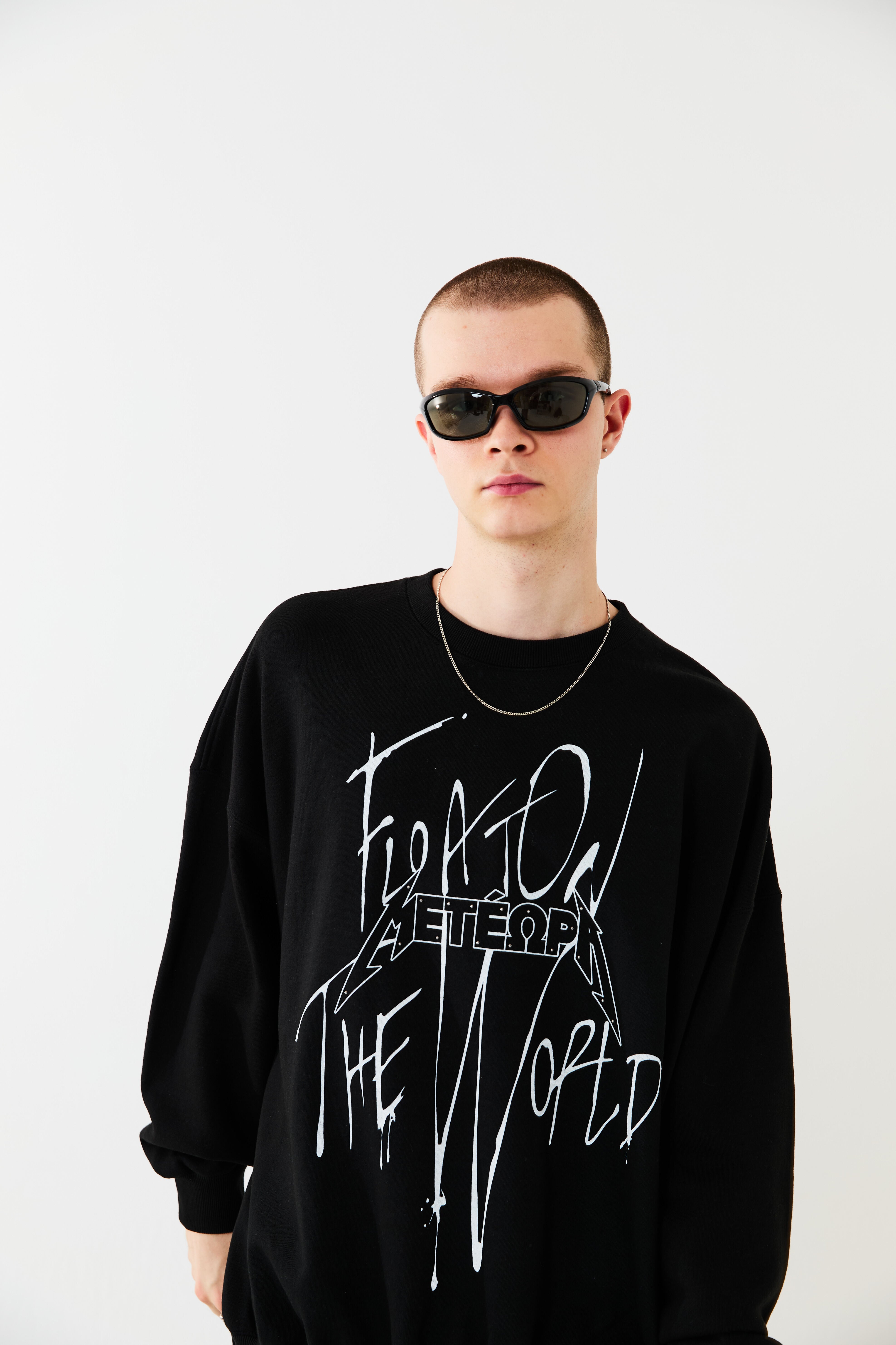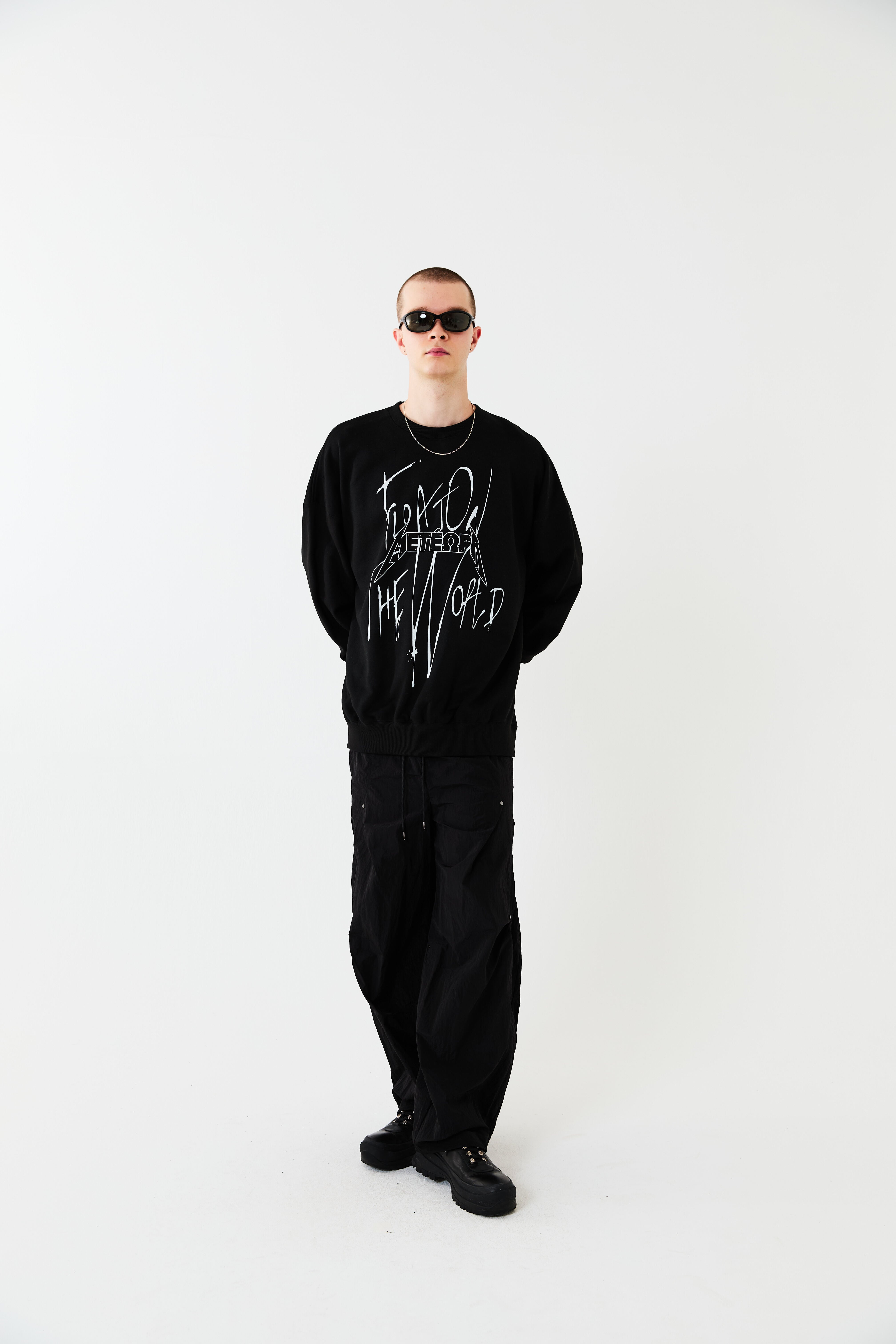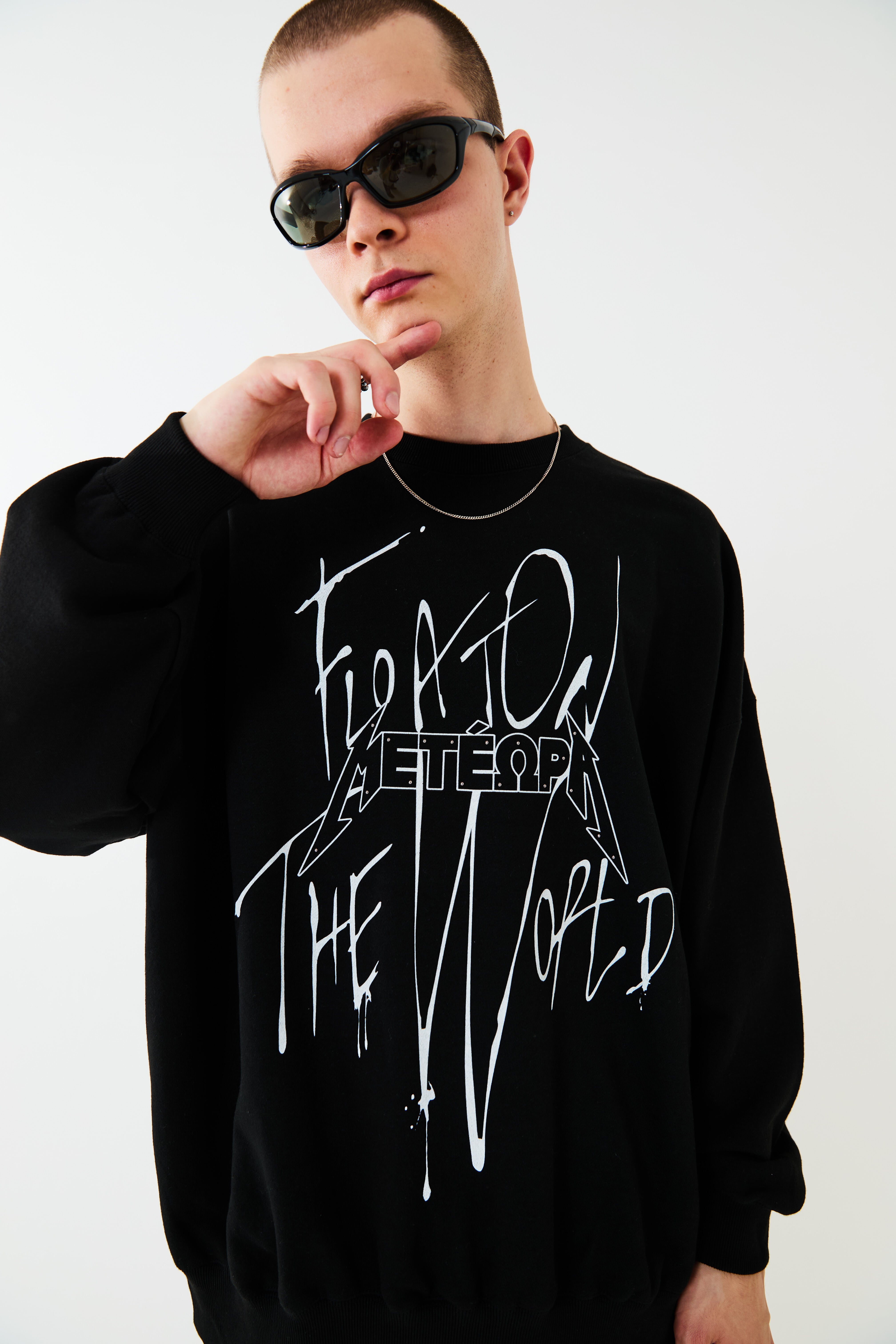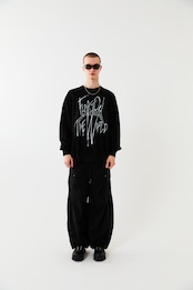 空に浮かぶ修道院メテオラをモチーフとしたグラフィックスウェット。落書きしたようなストリート感を演出しつつ、部分的にあしらったメタルのラインストーンで品の良さをプラスしています。ボディーはオーバーサイズシルエットに設計。リラックスムードでご着用いただけます。