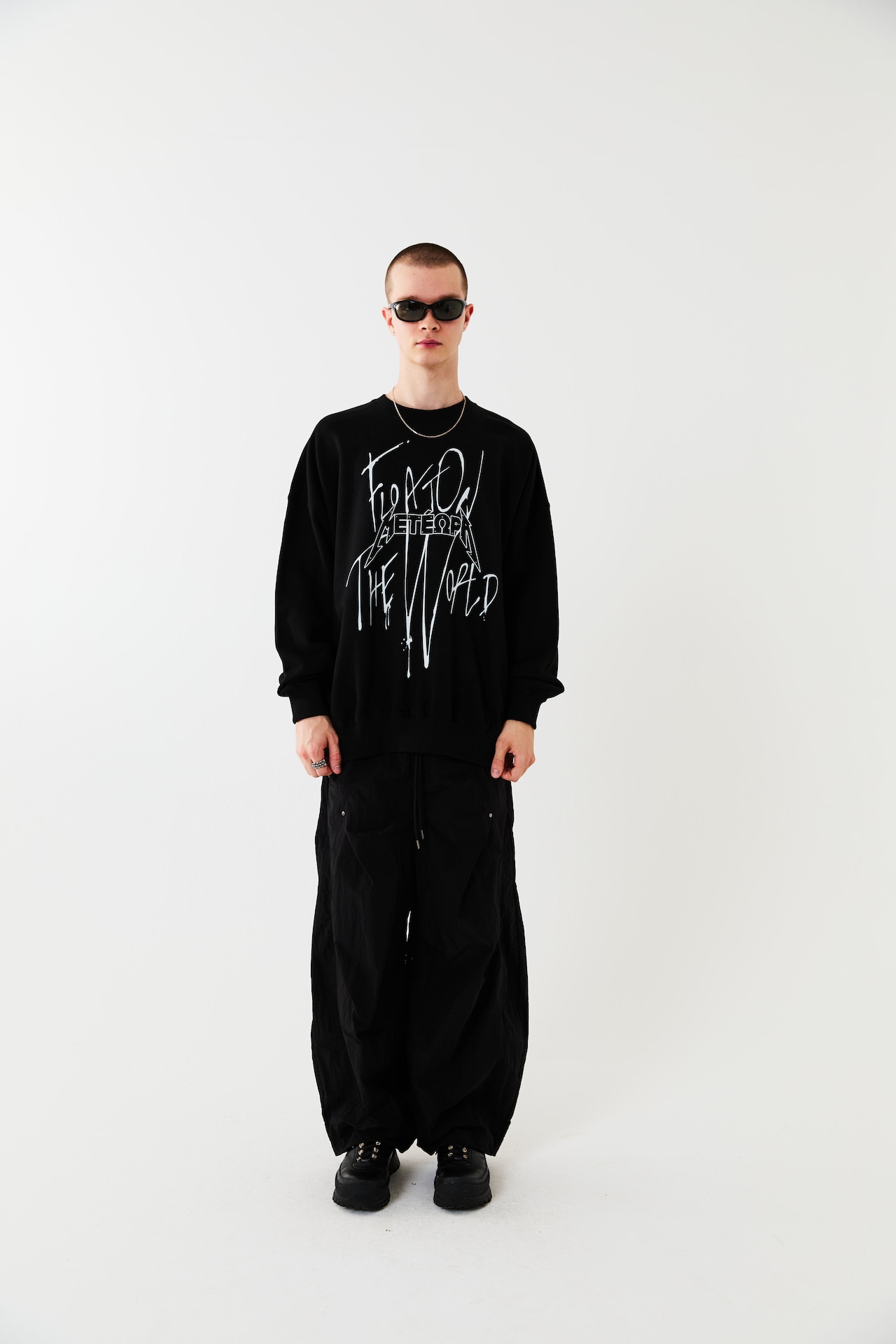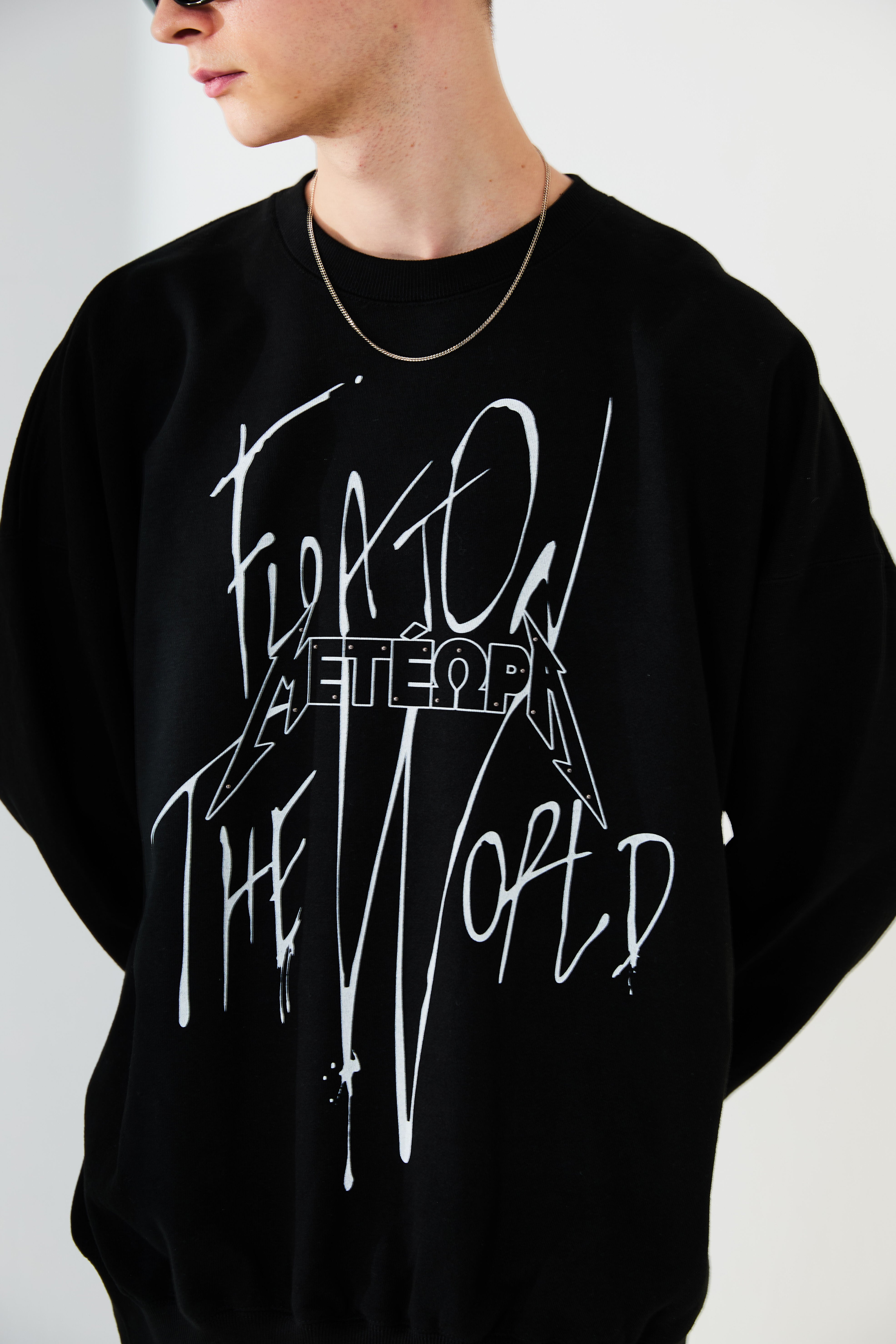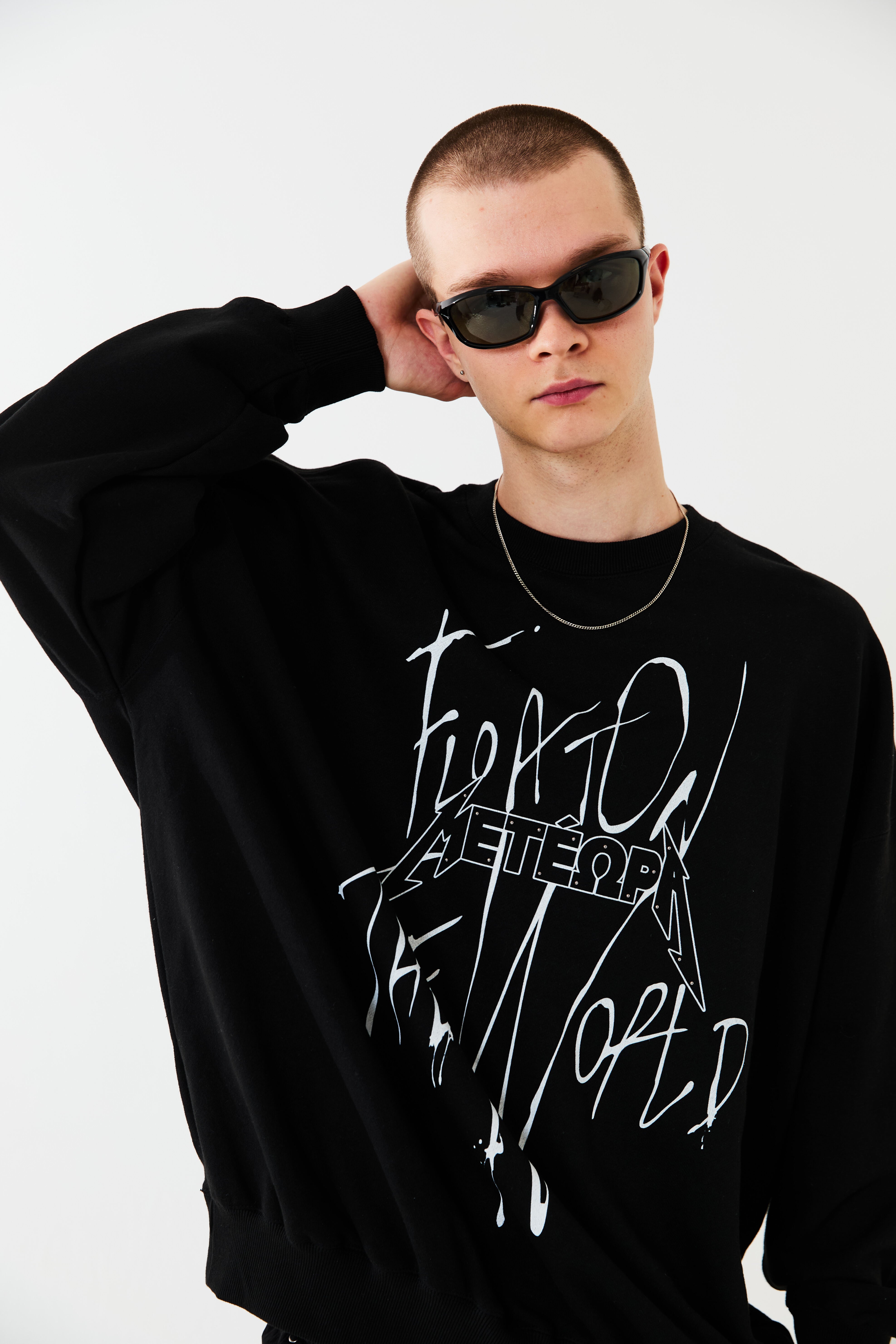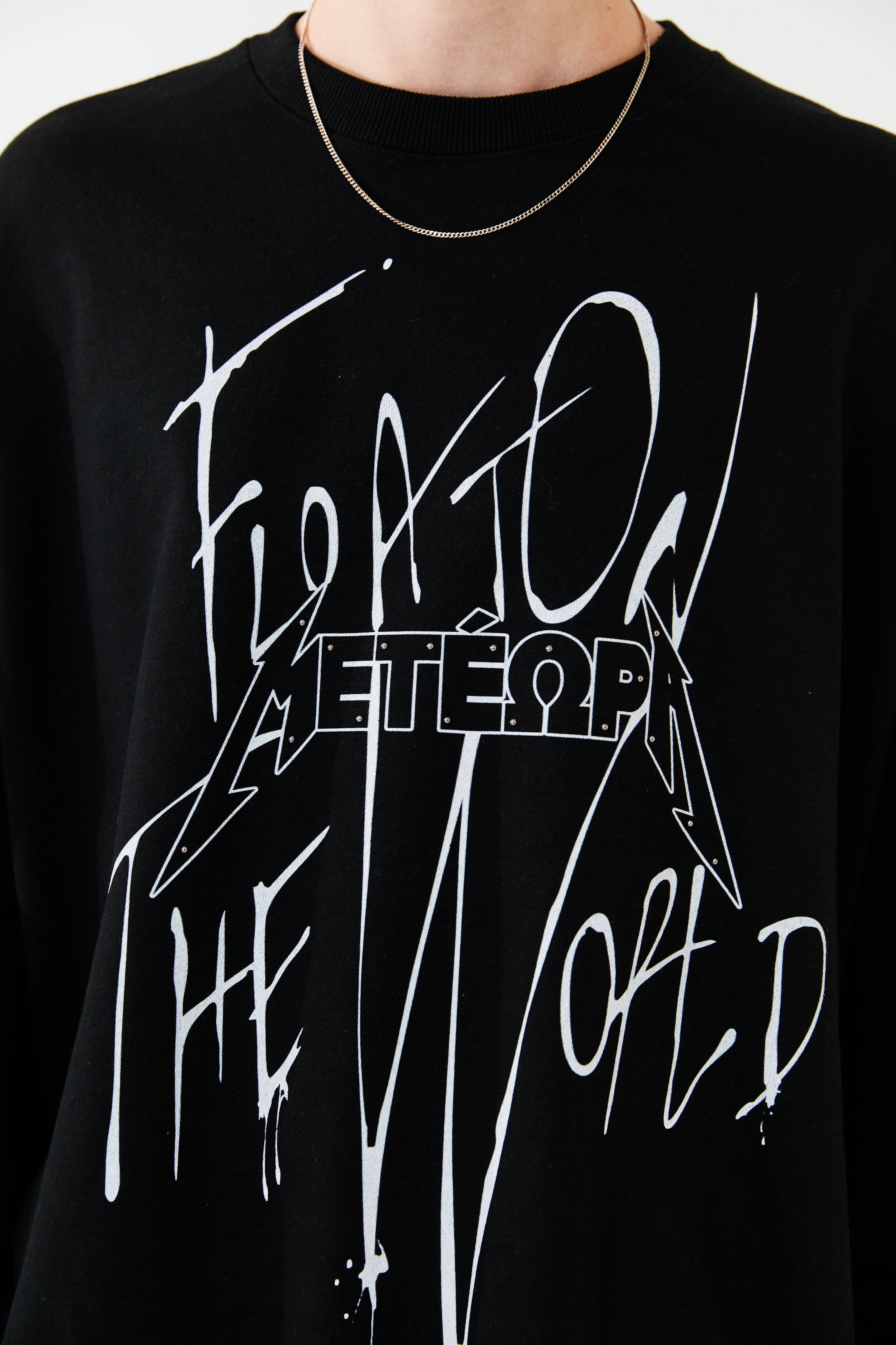 空に浮かぶ修道院メテオラをモチーフとしたグラフィックスウェット。落書きしたようなストリート感を演出しつつ、部分的にあしらったメタルのラインストーンで品の良さをプラスしています。ボディーはオーバーサイズシルエットに設計。リラックスムードでご着用いただけます。