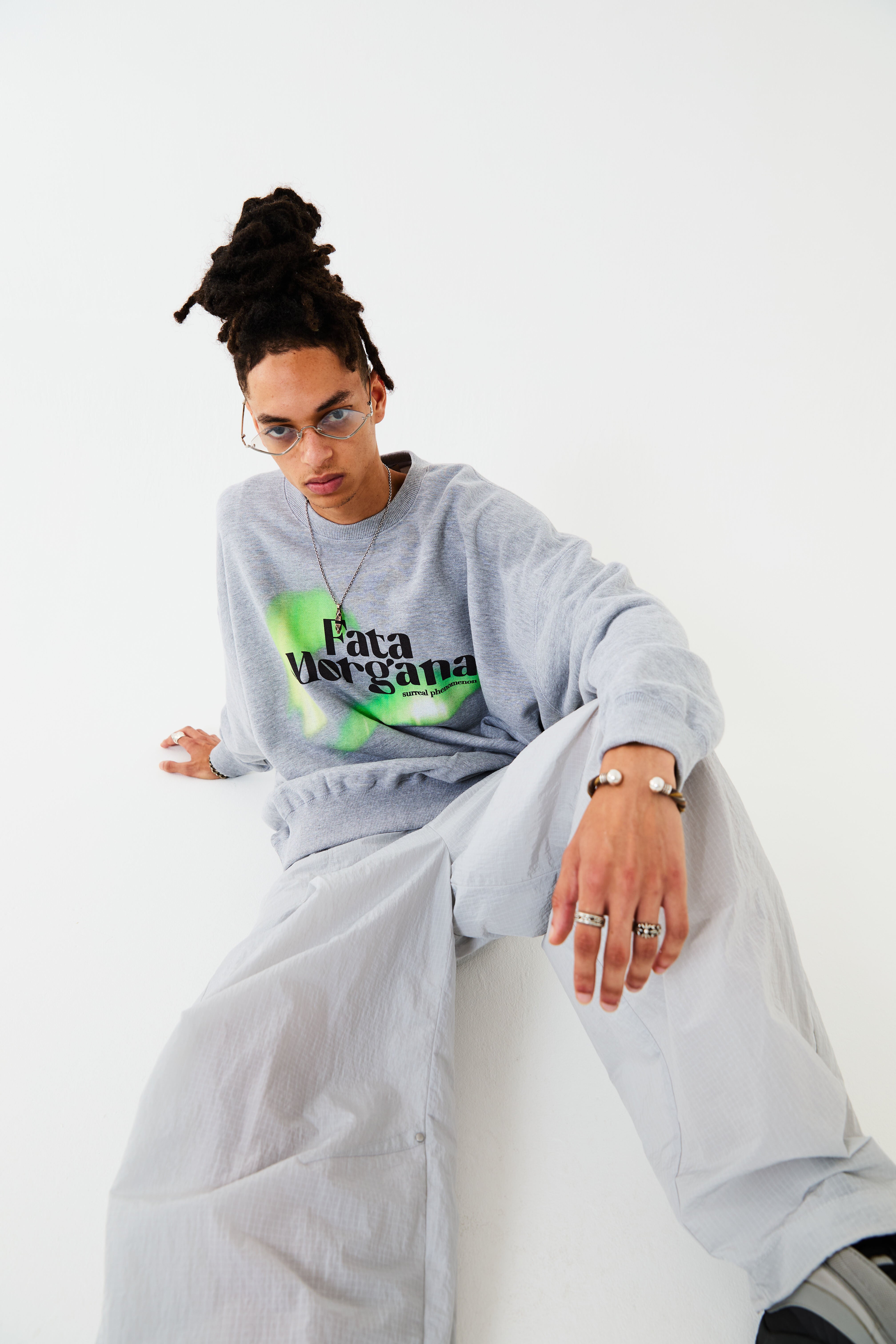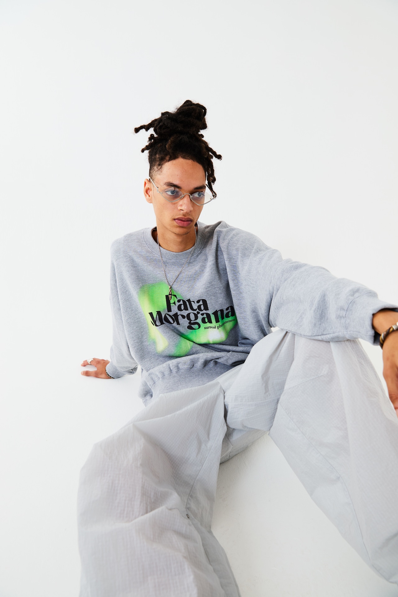 蜃気楼やオーロラをモチーフとしたグラフィックスウェット。「偶発的な美しさを再現性を持って洋服に落とし込む」というテーマで作成しています。インクジェットプリントによる鮮やかな色彩と陰影のある雰囲気が特徴のグラフィック。ボディーはオーバーサイズシルエットに設計。リラックスムードでご着用いただけます。