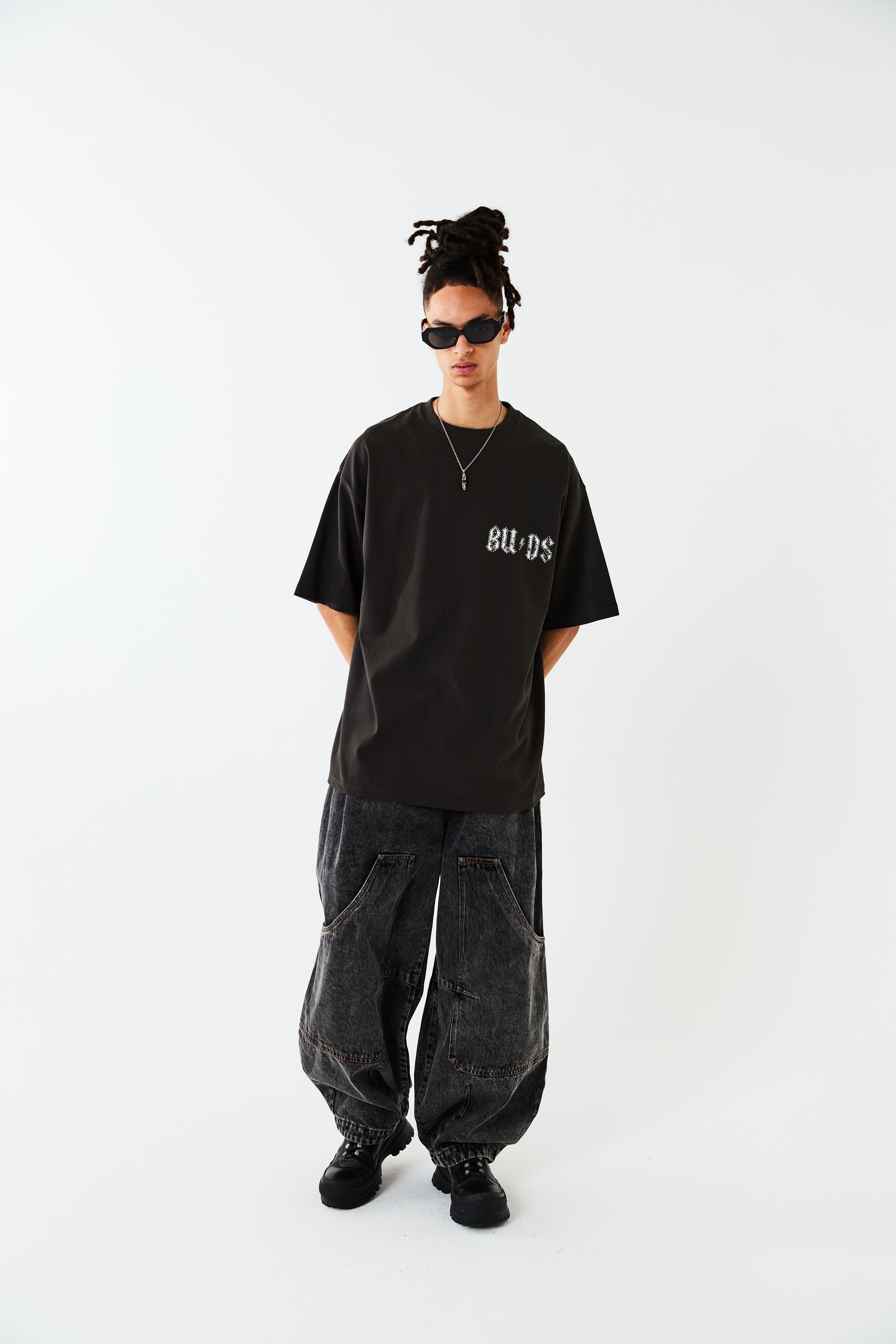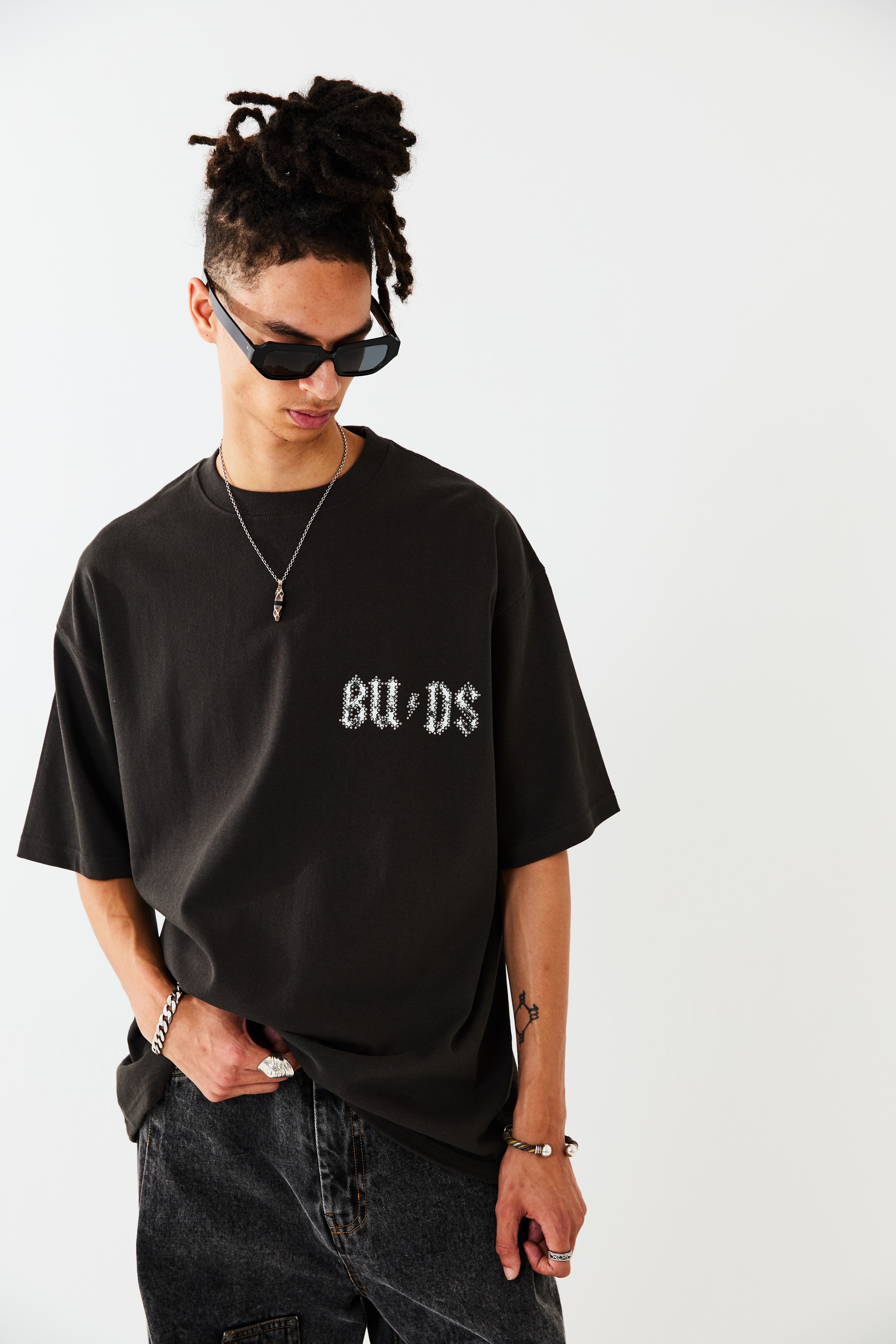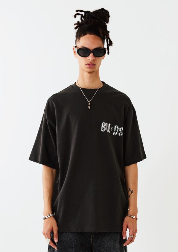 BUDS(つぼみ)をモチーフとしたグラフィックT-SH。左胸のモチーフにはメタルのラインストーンを重ねてプリントすることで、さりげなく、ハードな印象を与えています。歪みを持たせたバックプリントのデザインは幻影をイメージし、サイケデリックさを表現しています。ボディーはオーバーサイズシルエットに設計。リラックスムードでご着用いただけます。