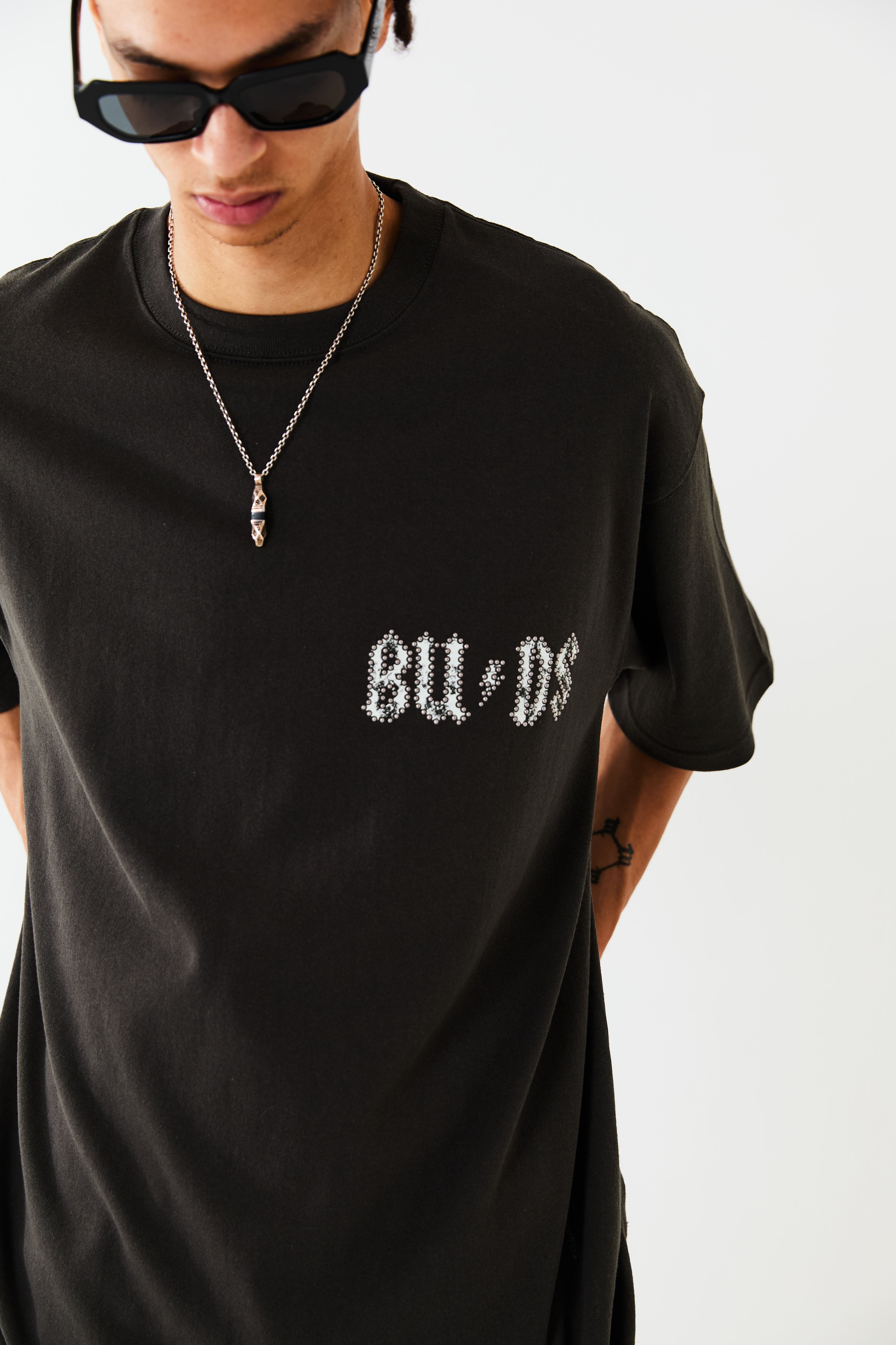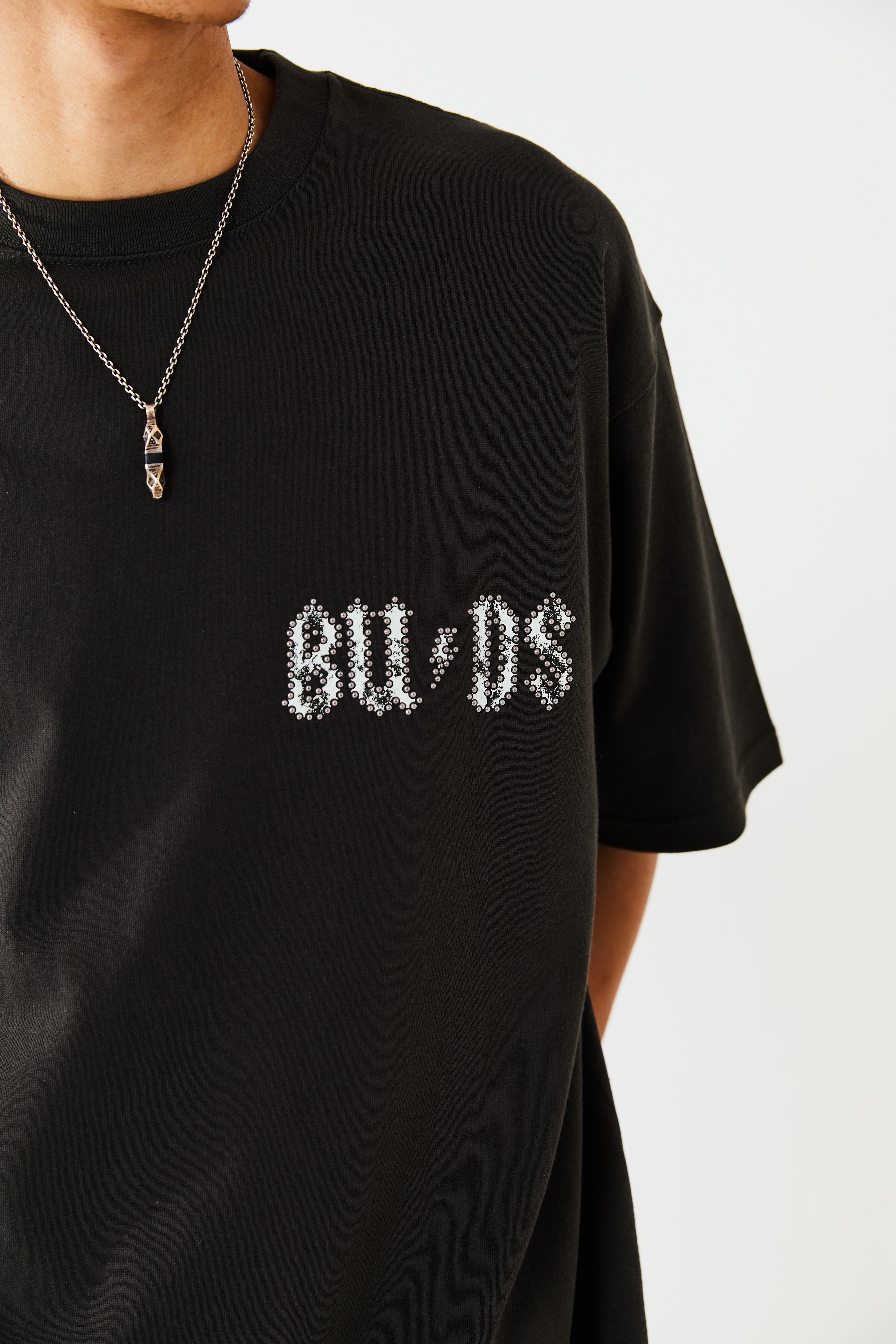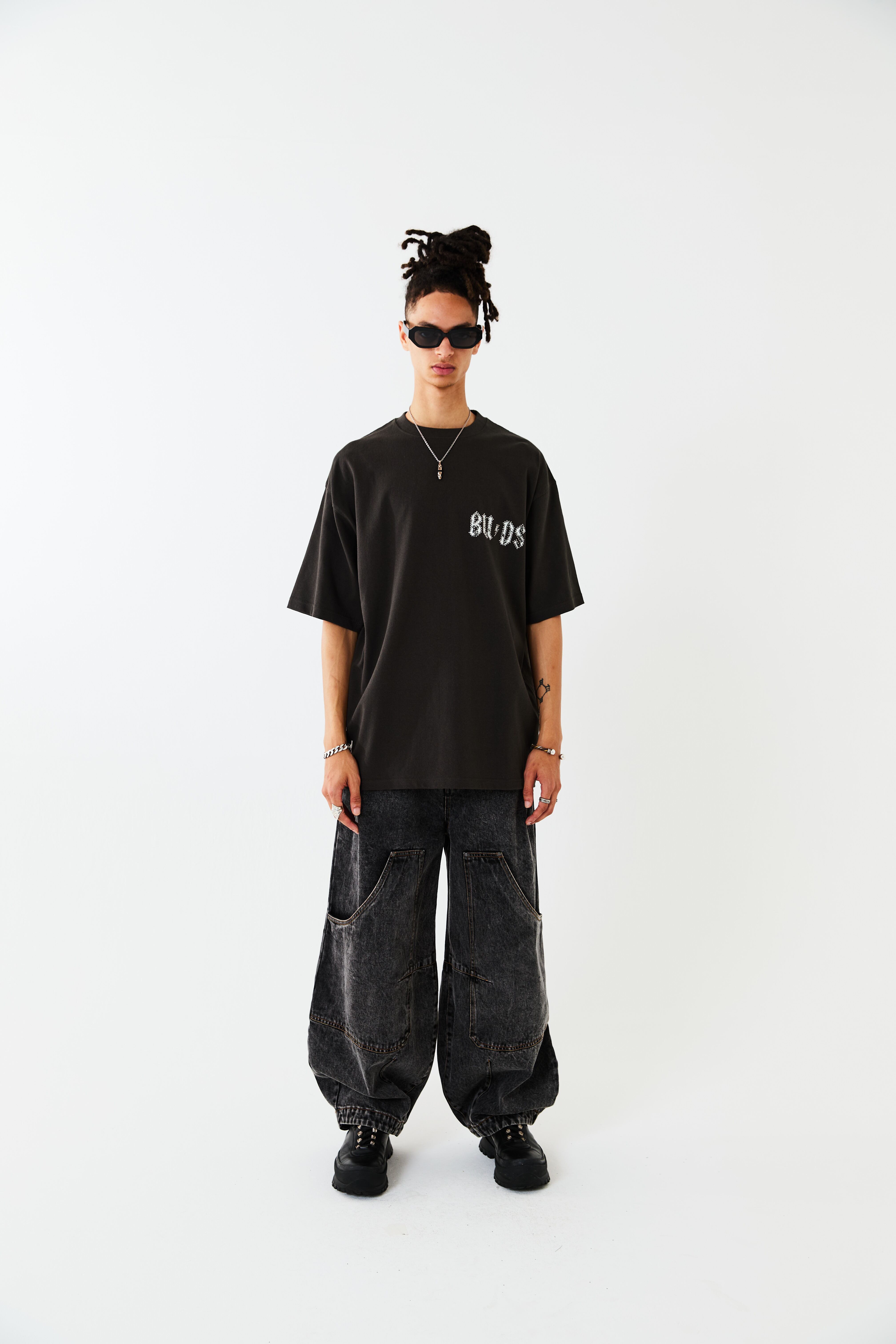 BUDS(つぼみ)をモチーフとしたグラフィックT-SH。左胸のモチーフにはメタルのラインストーンを重ねてプリントすることで、さりげなく、ハードな印象を与えています。歪みを持たせたバックプリントのデザインは幻影をイメージし、サイケデリックさを表現しています。ボディーはオーバーサイズシルエットに設計。リラックスムードでご着用いただけます。